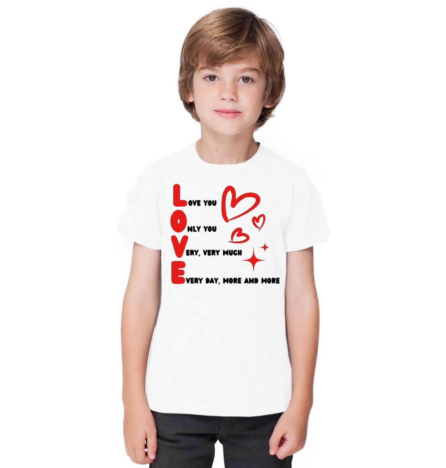 Dětské tričko Miluji tě Love You Only You. “Love you, only you, very, very much, every day, more and more.” znamená „Miluji tě, jen tebe, velmi, velmi moc, každý den, čím dál víc.“ Jednoduchý, ale silný motiv, který dokonale vyjadřuje emoce. Velké písmeno LOVE doplněné roztomilými srdíčky a milým textem vytváří design plný pozitivní energie a náklonnosti.