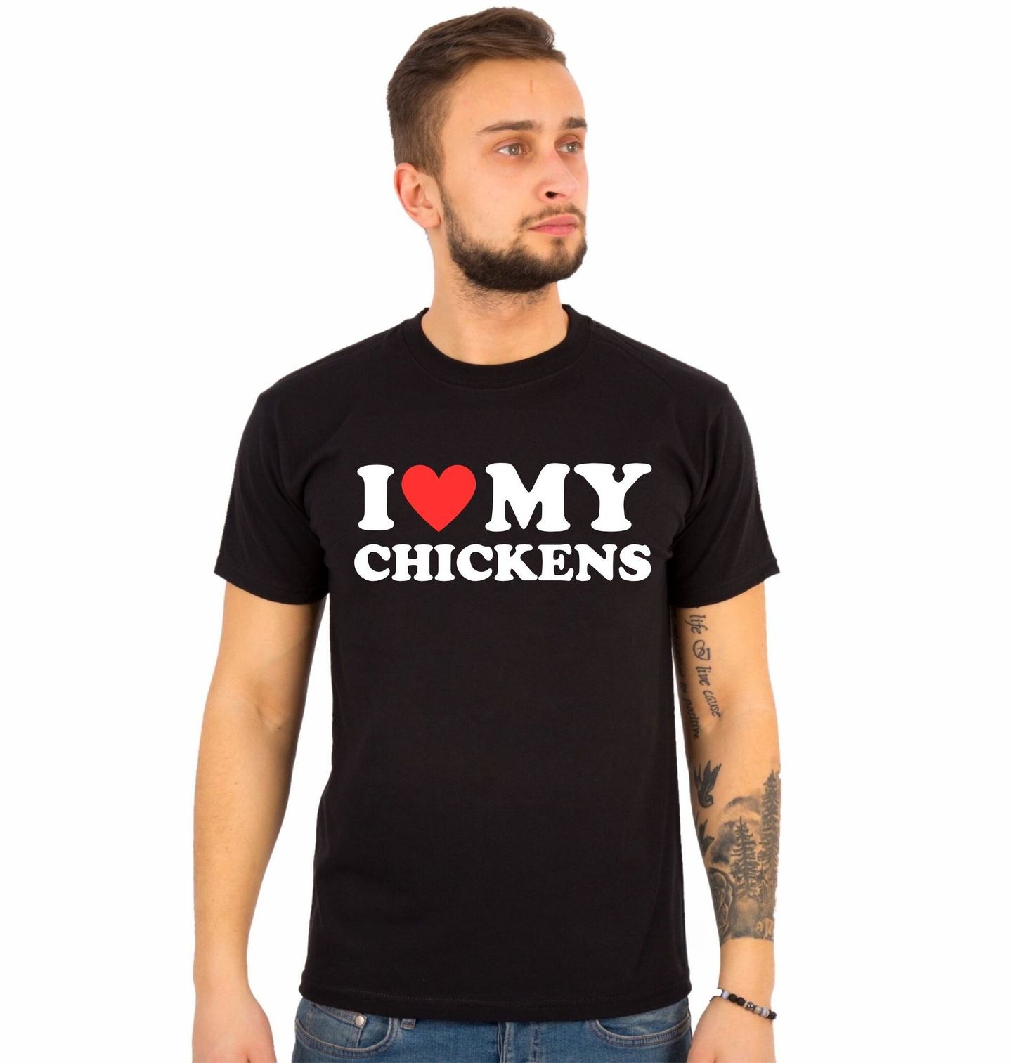 Pánské tričko Miluju své Slepice I Love My Chickens. Výrazný a osobní motiv pro všechny milovníky domácího chovu. Design obsahuje text “I love MY CHICKENS” (v překladu „Miluju svoje slepice“) doplněný ikonickým symbolem srdce. Jednoduché, ale silné sdělení ukazuje vztah mezi chovatelem a jeho zvířaty. Ideální pro farmáře, zahrádkáře i každého, kdo tráví čas na dvorku mezi slepicemi.