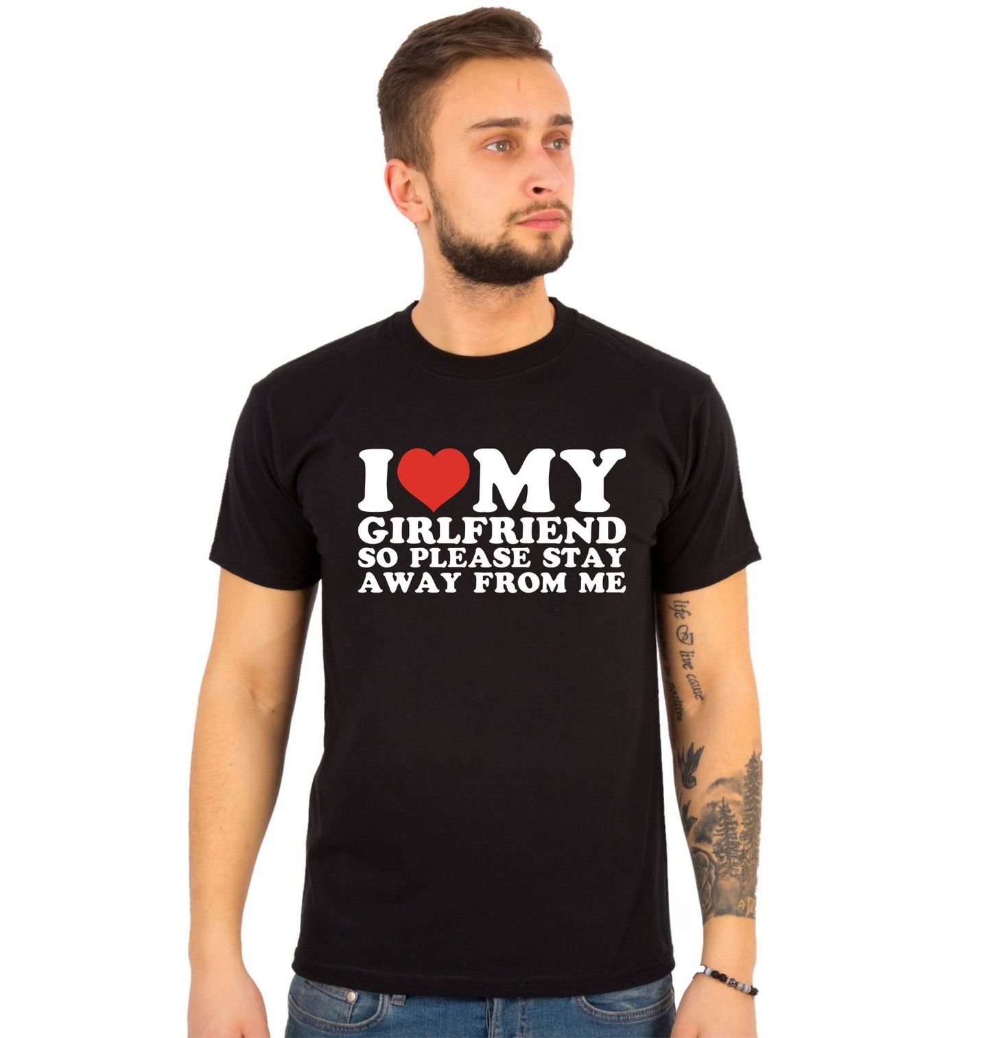 Pánské tričko Miluju svoji přítelkyni, takže se ode mě prosím drž dál. Vtipný textový motiv s romantickým nadhledem ukazuje, že láska může mít i humornou stránku. Dominantní nápis „I love My Girlfriend So Please Stay Away From Me“ znamená v překladu „Miluju svoji přítelkyni, takže se ode mě prosím drž dál.“ Jednoduchý design je ideální pro každého, kdo chce dát stylově najevo oddanost partnerce a zároveň pobavit své okolí originálním potiskem.