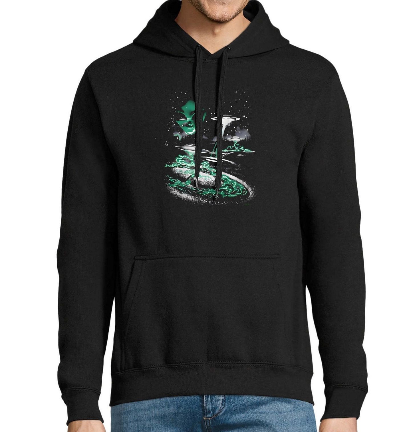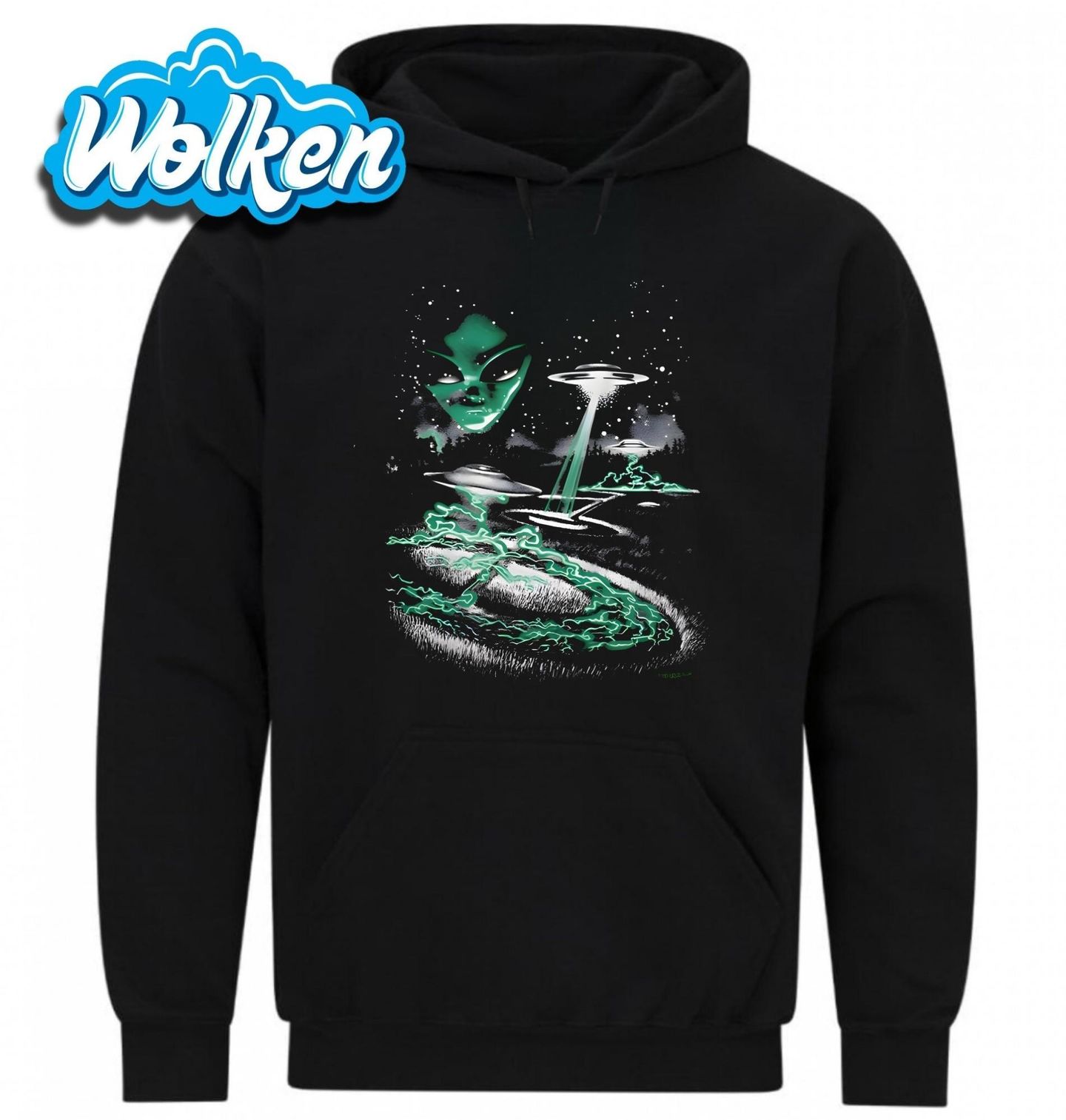 Pánská mikina Mimozemská invaze. Vesmír volá! Stylové triko s motivem mimozemšťana, UFO a kruhů v obilí je ideální pro všechny fanoušky záhad, sci-fi a mimozemského života. Záře talířů, energetické stopy a ikonický obličej zeleného návštěvníka dávají najevo, že "něco" se skutečně děje.