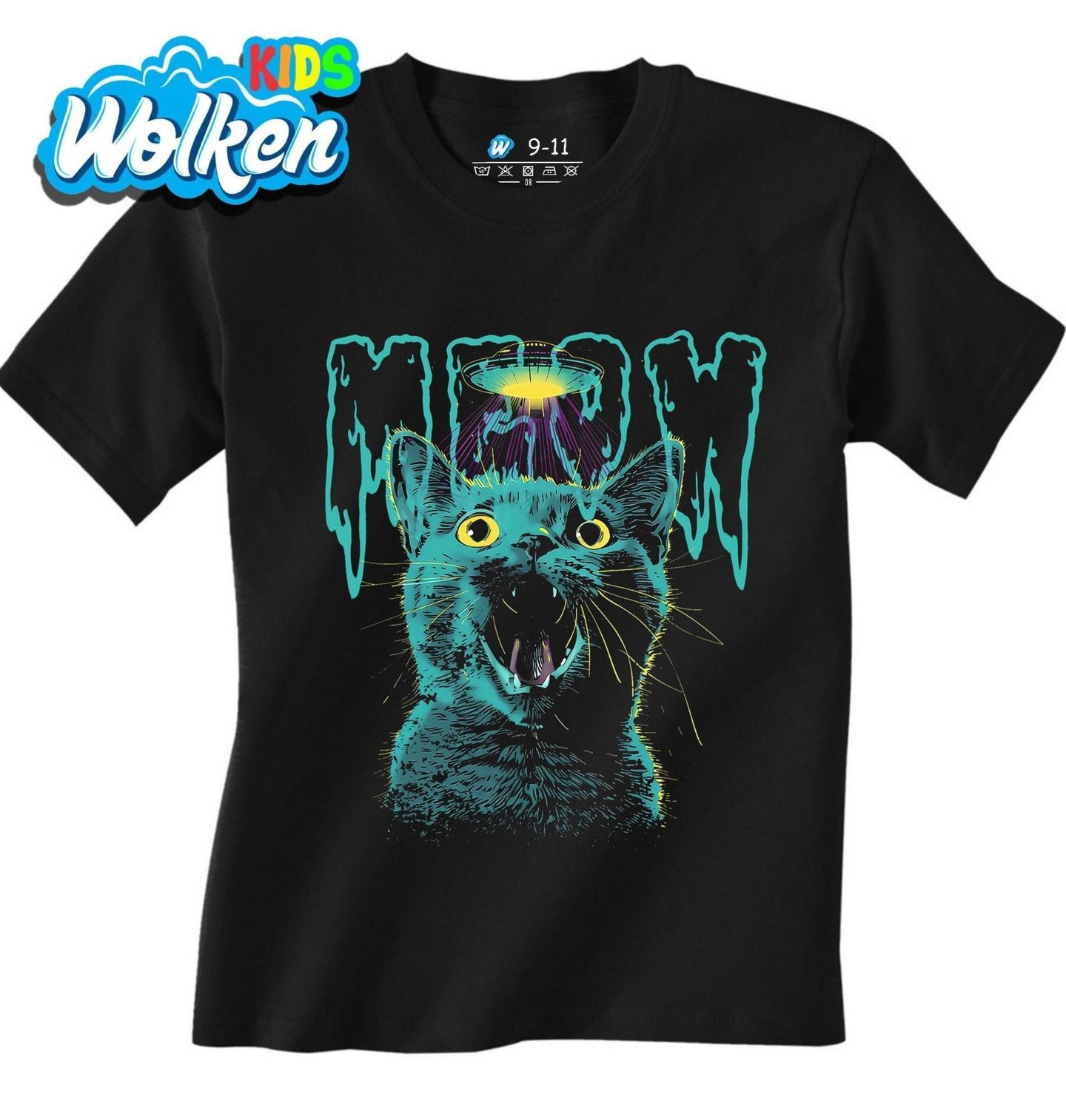 Dětské tričko Mimozemská Kočka Meow. Když kočka mňoukne až do vesmíru, mimozemšťané odpoví! Stylová a šílená ilustrace s vykulenou kočkou pod zářícím UFO, které ji právě unáší nebo možná jen přijímá její galaktické „meow“. Neonové barvy, výrazná kresba a sci-fi atmosféra dělají z tohoto motivu ideální volbu pro každého milovníka vesmíru.
