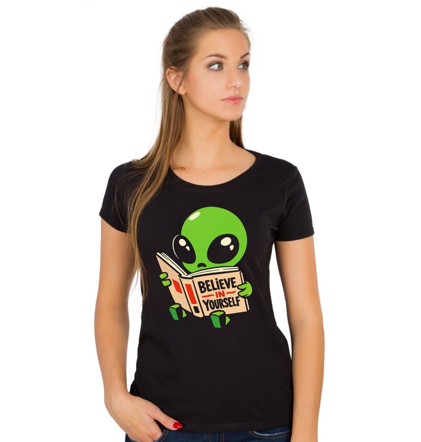 Dámské tričko Mimozemšťan s Knihou. Tento hravý design zobrazuje roztomilého mimozemšťana ponořeného do knihy s nápisem „Believe in Yourself“ (Věř si). Kombinuje humor, inspiraci a lehce sci-fi atmosféru, která připomíná, že sebevědomí je univerzální.