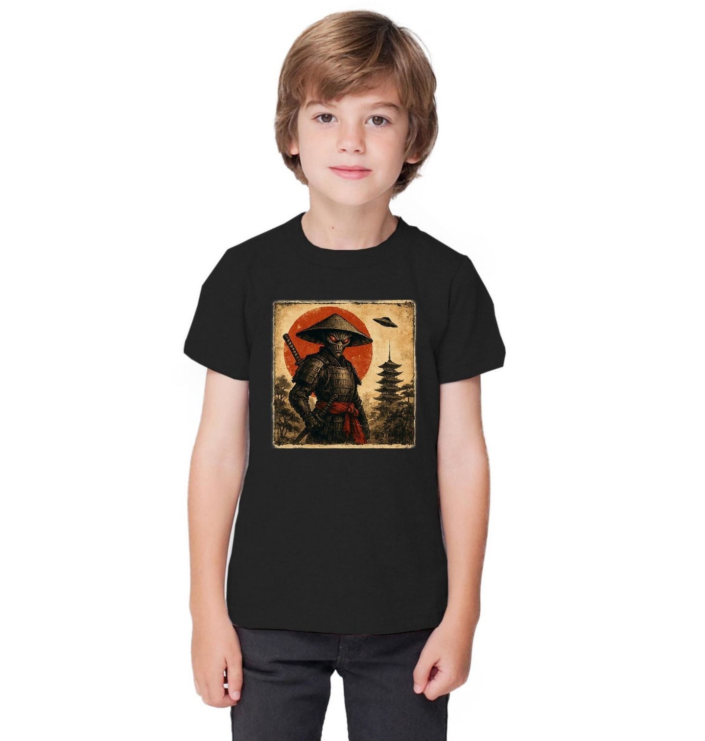 Dětské tričko Mimozemšťan Samuraj před Pagodou. Originální a tajemný motiv, který spojuje svět sci-fi a tradice. Na ilustraci stojí temný mimozemšťan oblečený jako samuraj v plné zbroji. Za ním se tyčí tradiční japonská pagoda a na pozadí září rudé slunce symbolizující Japonsko. Ve vzduchu je dokonce vidět i UFO – jako důkaz, že tenhle bojovník přilétl z jiné galaxie.