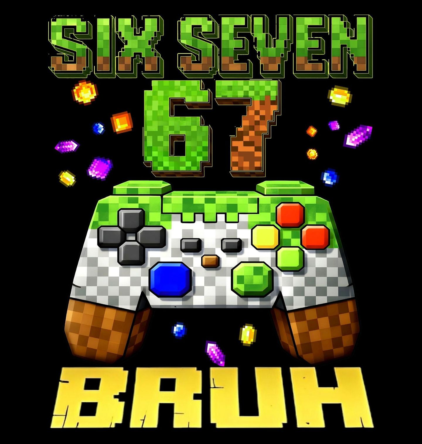 Dámské tričko Minecraft Ovladač 67 Six Seven Bruh. Stylový a vtipný motiv 67 pro všechny, kdo milují minecraft, videohry a internetový meme humor! Na designu je výrazné číslo 67 v pixelovém stylu připomínajícím svět minecraft, doplněné o herní ovladač, drahokamy a nápis „BRUH“, který přesně vystihuje atmosféru každé legendární herní situace.