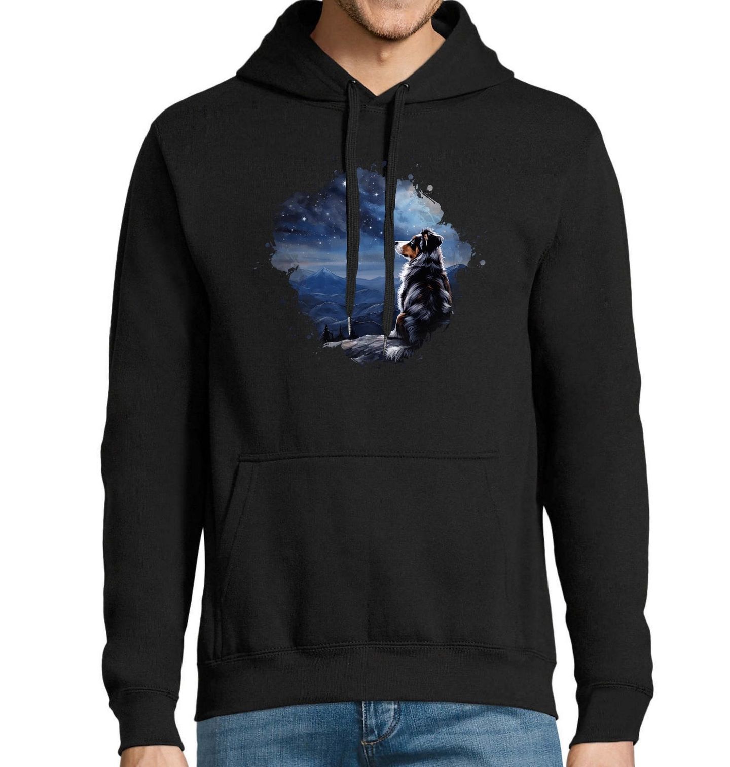 Pánská mikina Miniaturní australský ovčák pod Hvězdami. Nechte se unést do světa ticha, klidu a hvězd s tímto stylovým tričkem, které zachycuje pohledný motiv, kde Miniaturní australský ovčák sedí na skále a hledí do noční oblohy plné hvězd. Tento design osloví každého pejskaře, který má rád přírodu, toulky krajinou a samozřejmě každého, pro koho je pes víc než jen zvíře – je to společník duše.