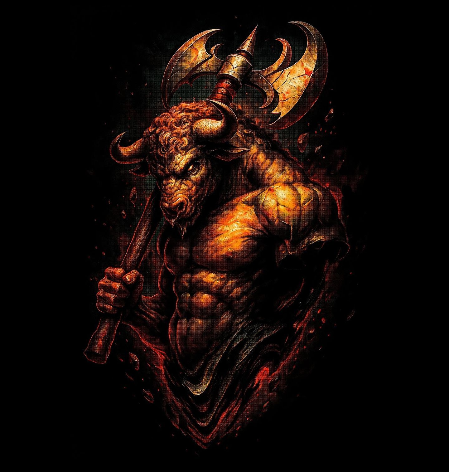 Pánská mikina Minotaurus Strážce labyrintu. Temný a silný motiv zachycuje Minotaura, jednu z nejděsivějších bytostí, jaké řecká mytologie zná. Napůl muž, napůl býk – symbol brutální síly, chaosu a primitivní energie. Podle legend byl Minotaurus uvězněn v obrovském labyrintu, který nechal postavit král Mínós. Tento spletitý komplex chodeb navrhl vynálezce Daidalos tak, aby z něj nebylo úniku.