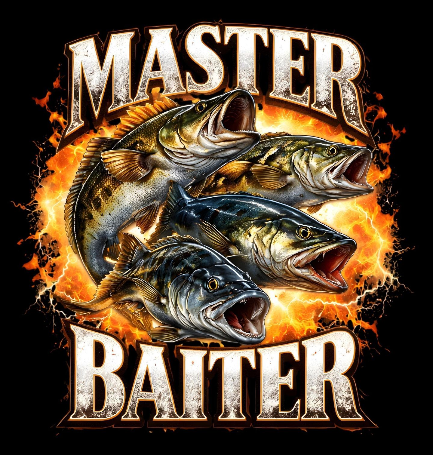 Pánské tričko Mistr Návnad. Dynamický rybářský design s nápisem “MASTER BAITER” (slovní hříčka – doslova „Mistr návnad“) doplněný realistickým motivem ryb v akci a ohnivým pozadím. Design působí energicky a drsně, ideální pro vášnivé rybáře, kteří mají smysl pro humor a chtějí zaujmout. Skvělý dárek pro každého milovníka rybaření, který si rád užívá svůj koníček naplno.