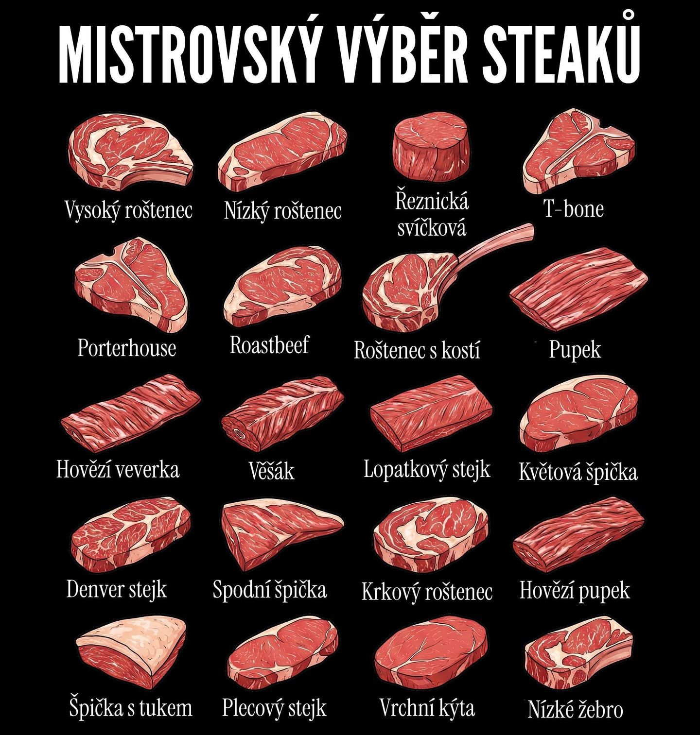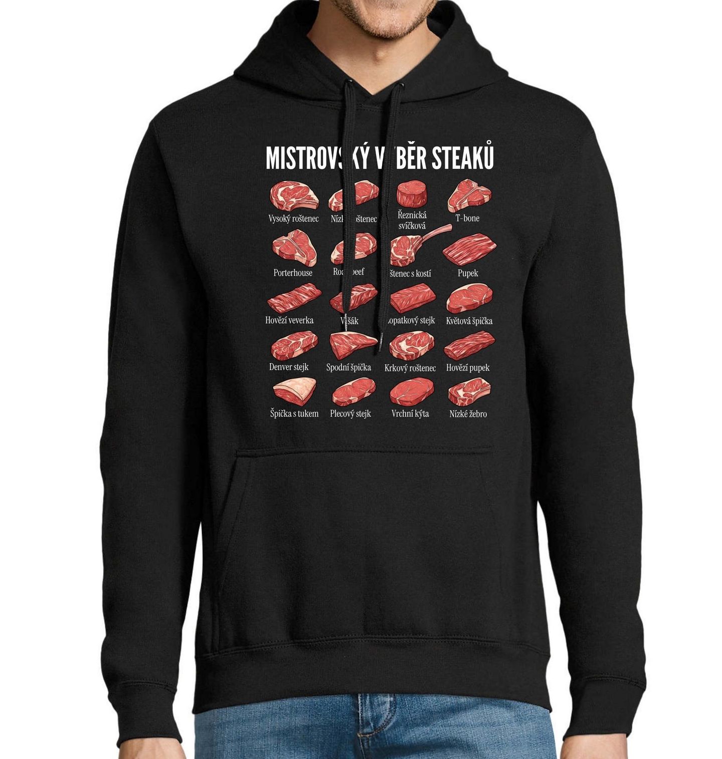 Pánská mikina Mistrovský Výběr Steaků. Perfektní pro všechny milovníky grilování, BBQ a pořádných steaků. Na motivu najdeš: Vysoký roštěnec, Nízký roštěnec, Řeznická svíčková, T-bone, Porterhouse, Roastbeef, Roštěnec s kostí, Pupek, Hovězí veverka, Věšák, Lopatkový stejk, Květová špička, Denver stejk, Spodní špička, Krkový roštěnec, Hovězí pupek, Špička s tukem, Plecový steik, Vrchní kýta, Nízké žebro.