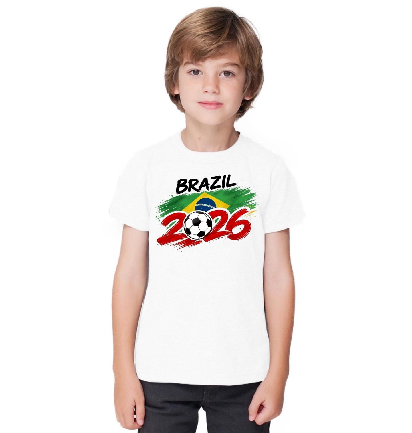 Dětské tričko Mistrovství Světa ve Fotbale Brazílie 2026. Dynamický motiv spojuje výrazné barvy a symboly, které jasně patří zemi Brazílie. Nápis Brazil, stylizovaný letopočet a fotbalový míč doplněný ikonickou zeleno-žluto-modrou vlajkou vytváří energický design inspirovaný atmosférou turnaje Mistrovství světa ve fotbale. Tento motiv vystihuje radost ze hry, vášeň fanoušků a legendární styl brazilského fotbalu.