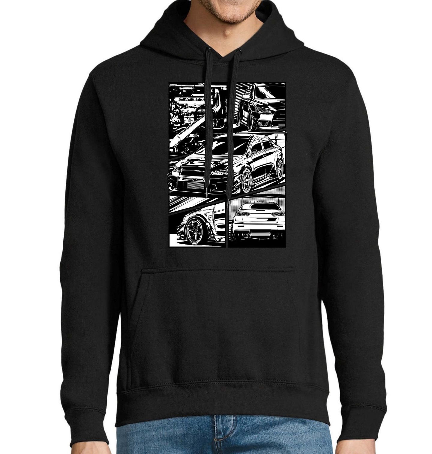 Pánská mikina Mitsubishi Lancer Evolution X JDM Car. Dynamický motiv zachycuje ikonické japonské auto Mitsubishi Lancer Evolution v agresivním tuning stylu. Detailní černobílá grafika zvýrazňuje sportovní linie karoserie, upravený podvozek i technické detaily, které dávají tomuto vozu nezaměnitelný charakter. Design je ideální pro každého, kdo miluje rychlé auto, výkon a moderní JDM scénu. Grafika působí jako stránka z manga komiksu.