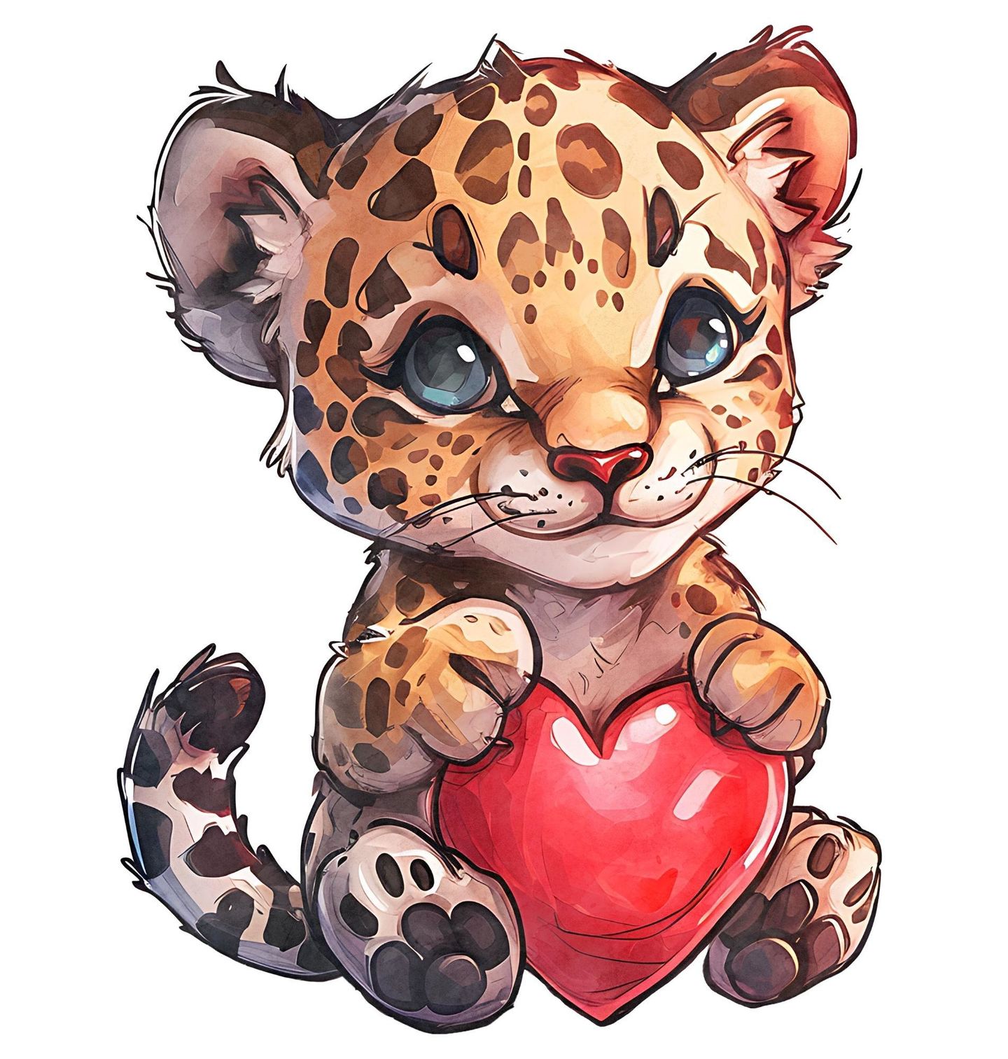 Pánské tričko Mládě Geparda se Srdem. Roztomilý a výrazný motiv zobrazuje stylizovaného geparda, který v tlapkách drží červené srdce. Přestože je gepard šelma typická pro africkou savanu, v tomto provedení působí jemně, přátelsky a hravě. Ilustrace spojuje divokou přírodu s emocí a vytváří kontrast mezi silou zvířete a symbolem lásky.