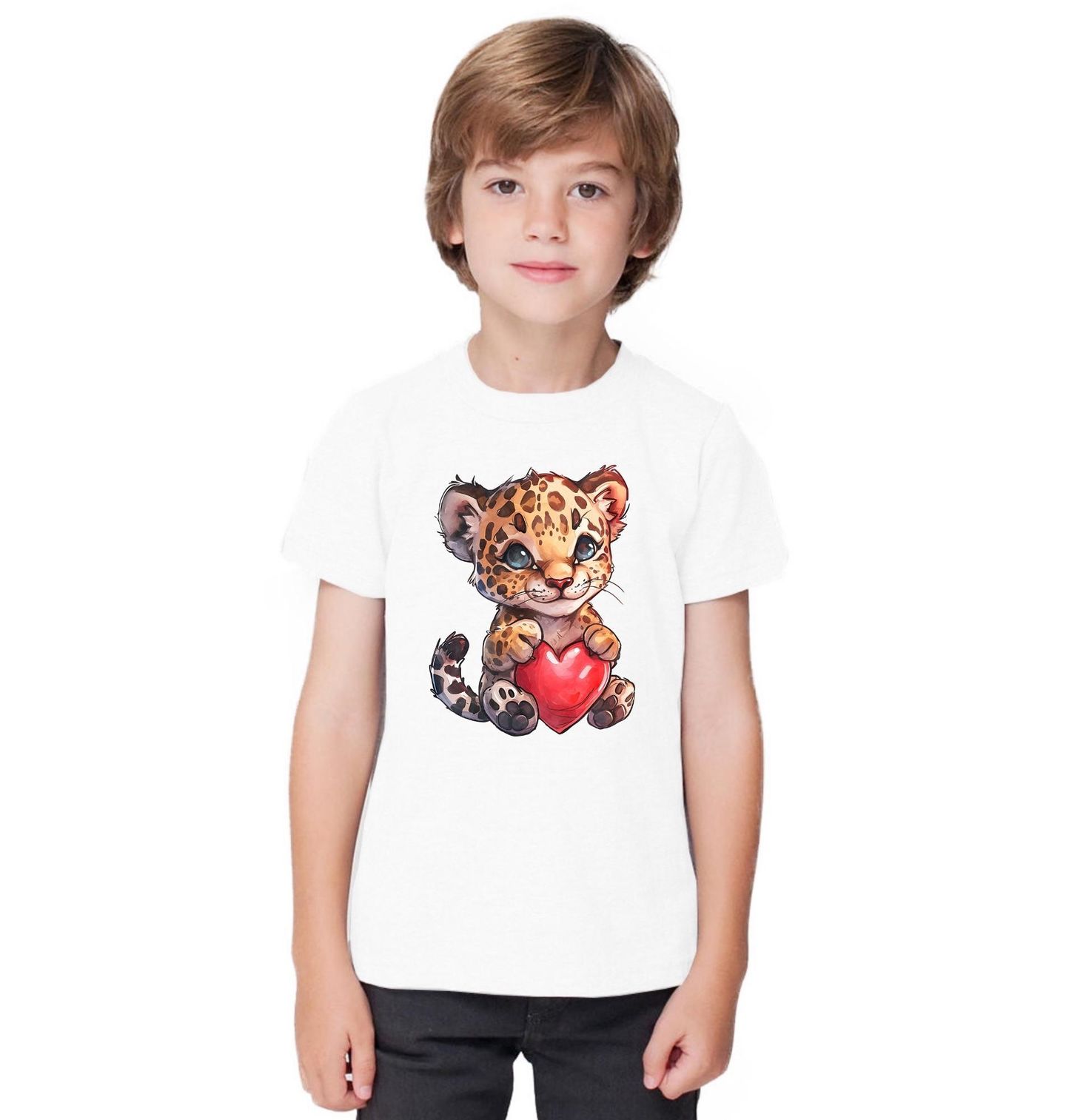 Dětské tričko Mládě Geparda se Srdcem. Roztomilý a výrazný motiv zobrazuje stylizovaného geparda, který v tlapkách drží červené srdce. Přestože je gepard šelma typická pro africkou savanu, v tomto provedení působí jemně, přátelsky a hravě. Ilustrace spojuje divokou přírodu s emocí a vytváří kontrast mezi silou zvířete a symbolem lásky.