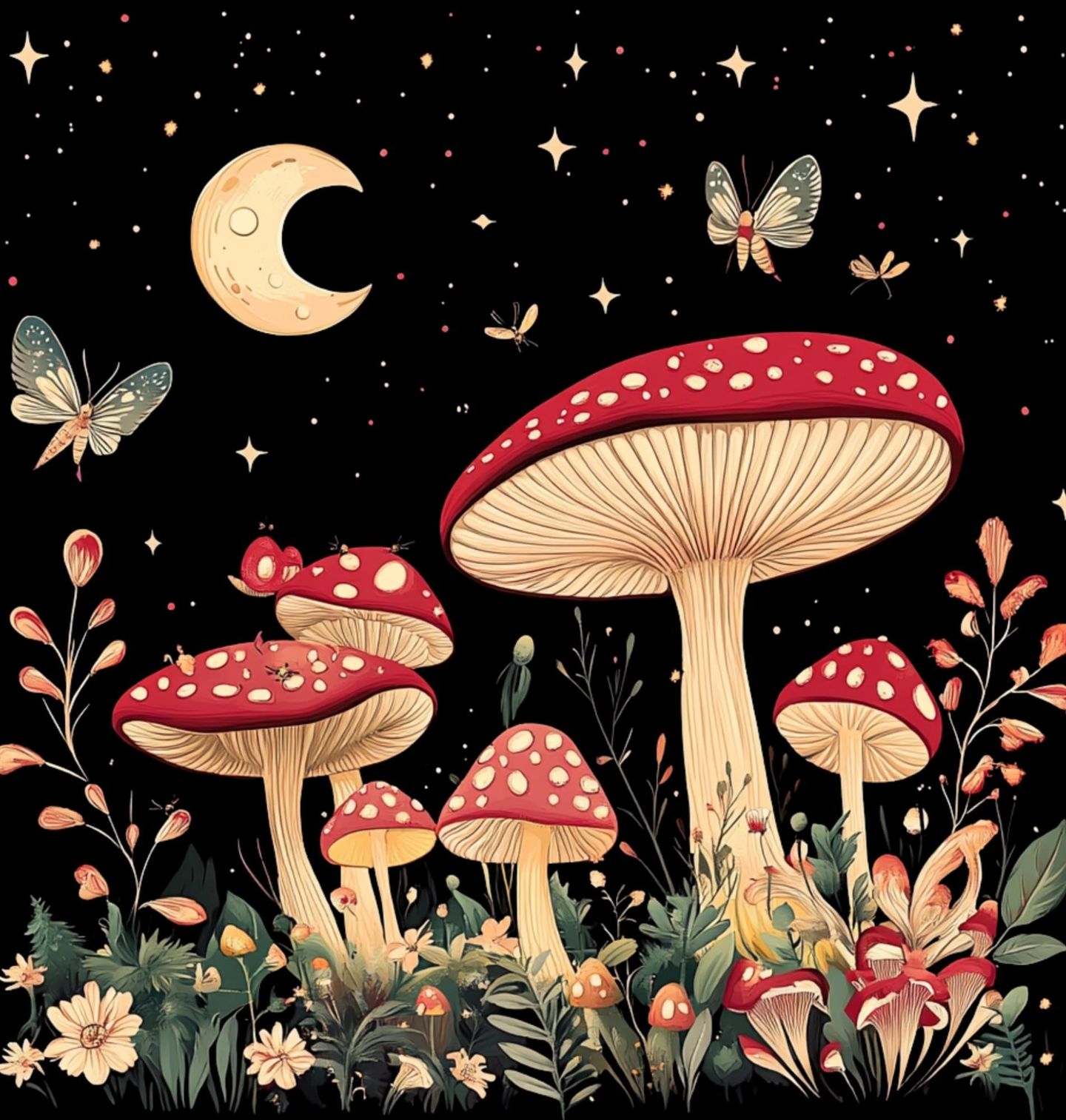 Dámské tričko Mochomůrky pod Nočním Měsícem. Okouzlující ilustrace, kde tichý les ožívá pod hvězdnou oblohou a jemným světlem, které vrhá měsíc. Hlavním motivem jsou výrazné houby, mezi nimiž vyniká ikonická mochomurka se svými typickými červenými klobouky. Celou scénu doplňují drobné detaily přírody a noční atmosféra plná klidu a magie. Potěší všechny milovníky přírody, pohádkových motivů a tajemných nocí.