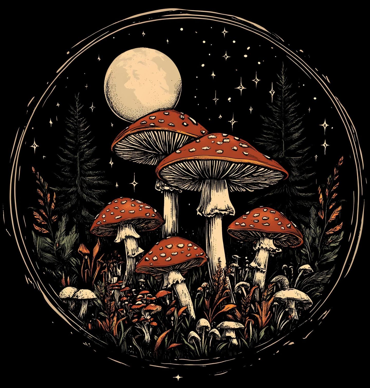 Pánské tričko Mochomůrky v Nočním Lese. Tajemný motiv, kde les ožívá pod svitem hvězd a zářícího nebe. Dominantou ilustrace jsou výrazné houby, zejména ikonická mochomurka, která dodává celé scéně magický a lehce pohádkový nádech. V pozadí se tyčí tichý les a nad ním svítí klidný měsíc, který umocňuje atmosféru nočního dobrodružství.