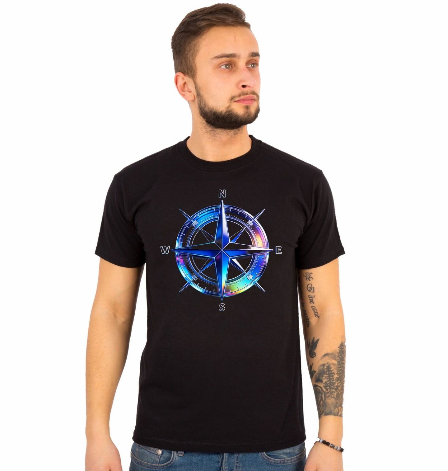 Pánské tričko Moderní Kompas. Tento výrazný design zobrazuje moderní kompas se všemi světovými stranami (N, S, E, W), který symbolizuje orientaci, cestování a hledání vlastního směru v životě. Ideální motiv pro dobrodruhy i milovníky minimalismu.
