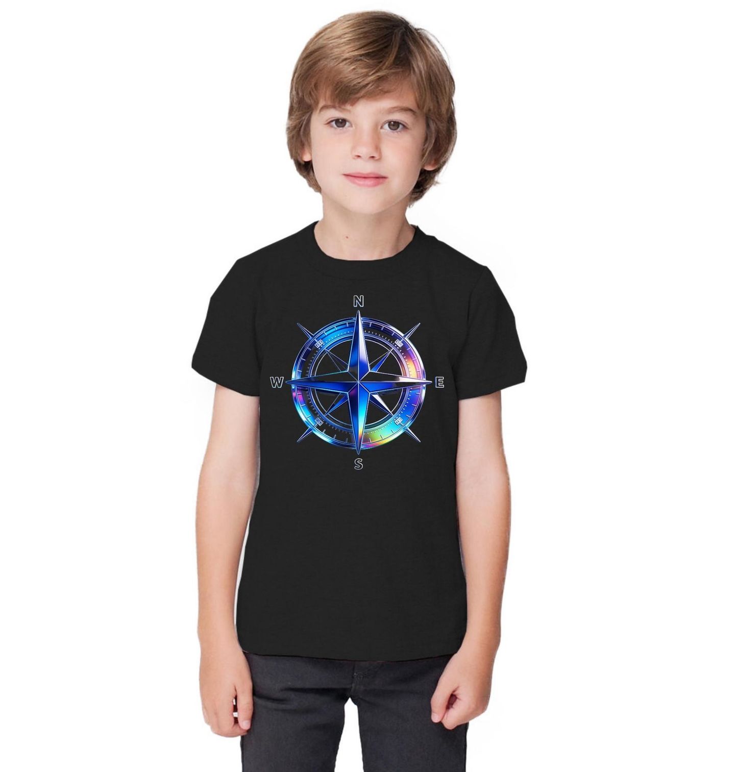 Dětské tričko Moderní Kompas. Tento výrazný design zobrazuje moderní kompas se všemi světovými stranami (N, S, E, W), který symbolizuje orientaci, cestování a hledání vlastního směru v životě. Ideální motiv pro dobrodruhy i milovníky minimalismu.