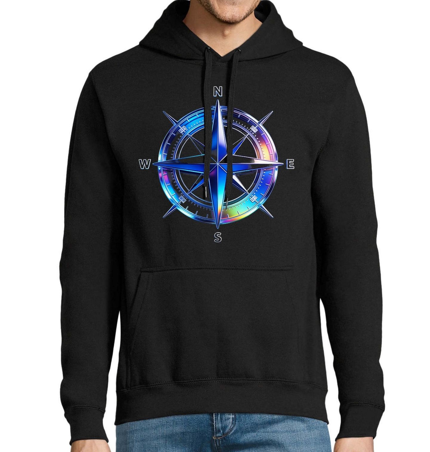 Pánská mikina Moderní Kompas. Tento výrazný design zobrazuje moderní kompas se všemi světovými stranami (N, S, E, W), který symbolizuje orientaci, cestování a hledání vlastního směru v životě. Ideální motiv pro dobrodruhy i milovníky minimalismu.