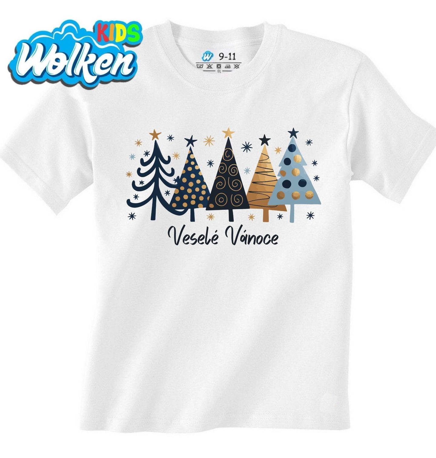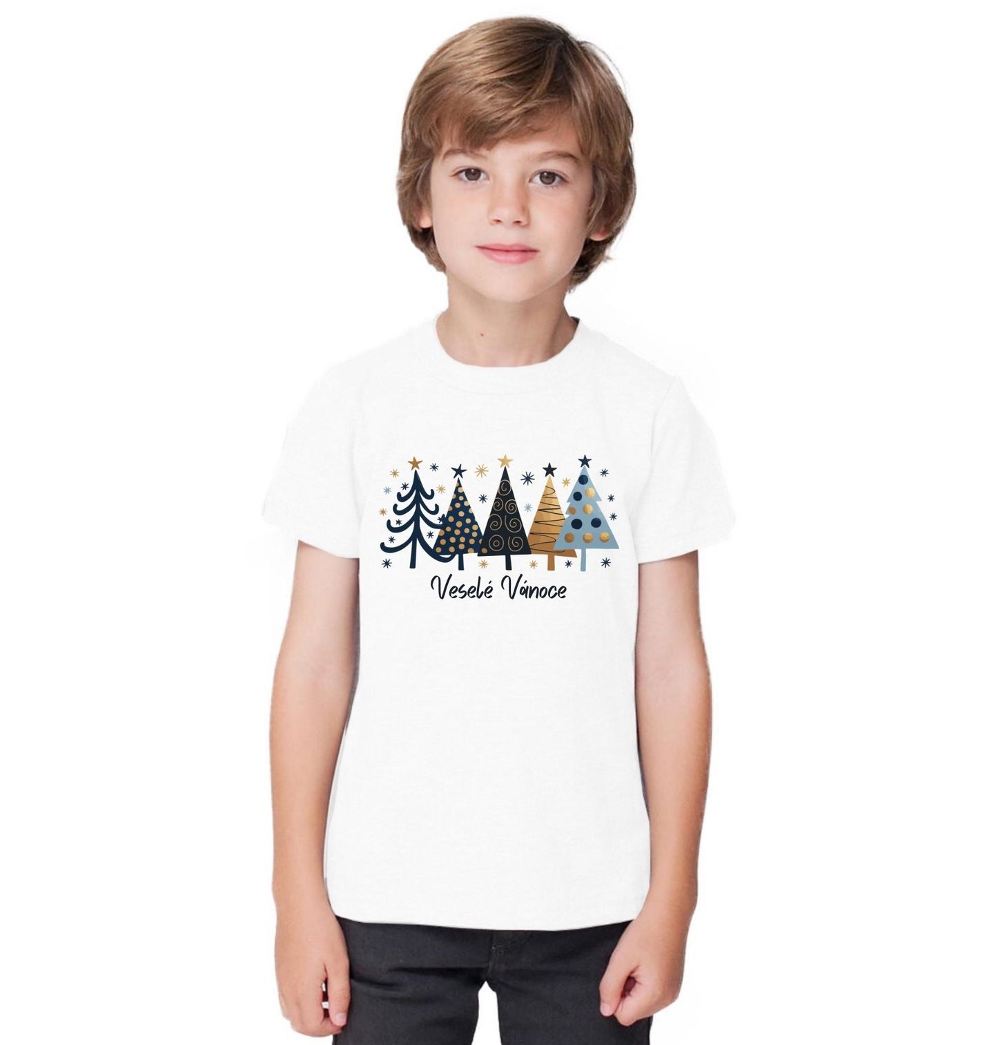 Dětské tričko Moderní Stromky Veselé Vánoce. Vánoce jsou časem radosti, tradic a krásné výzdoby. Tento moderní motiv s pěti stylizovanými vánočními stromky v elegantních odstínech zlaté, modré a černé přináší neotřelý pohled na klasické Vánoce. Vánoce nemusí být vždy červené – někdy stačí kapka zlata a hvězda navrch!