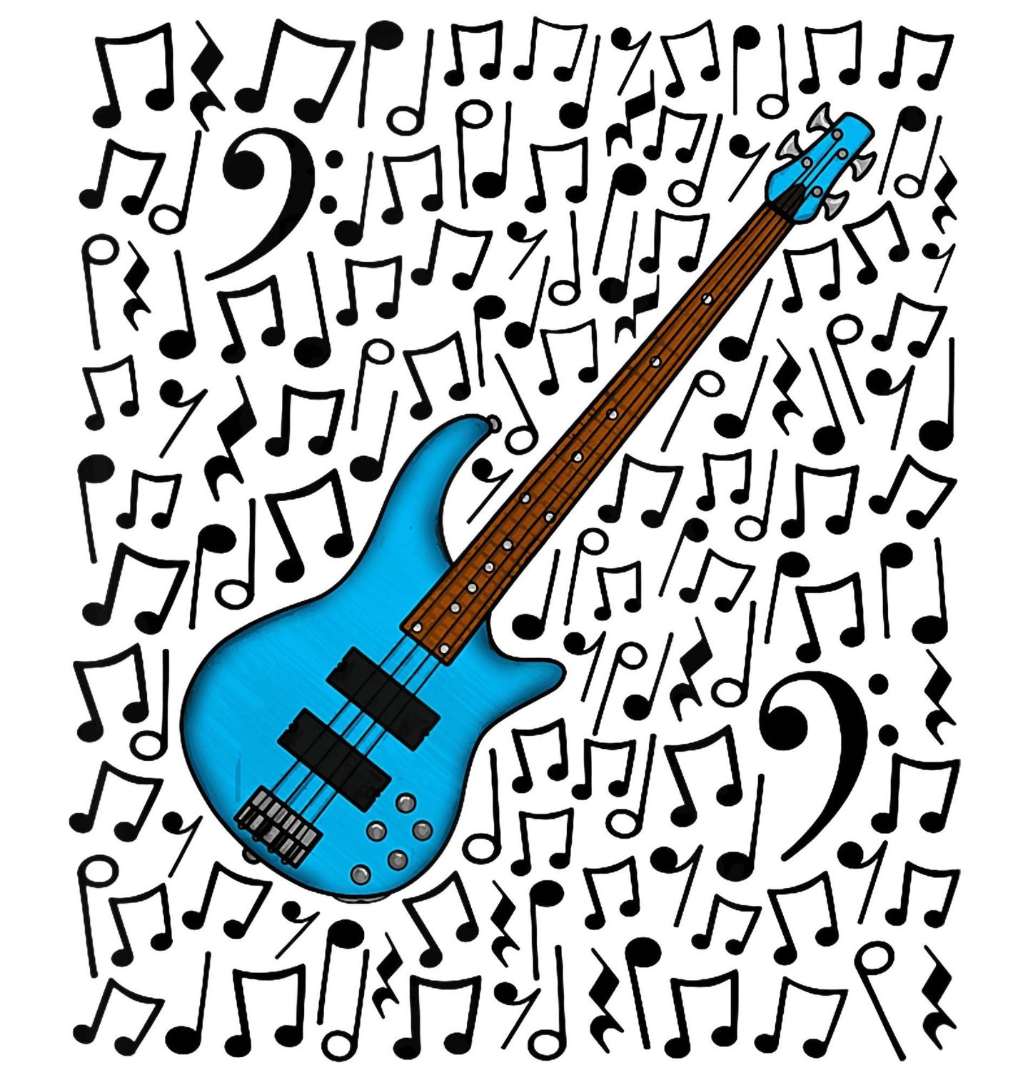 Pánské tričko Modrá Baskytara v Rytmu Not. Stylový hudební motiv, kde dominuje výrazná modrá baskytara obklopená dynamickým polem not a basových klíčů. Design působí hravě, rytmicky a zároveň moderně – ideální pro každého, kdo miluje hluboké tóny a sílu spodních frekvencí. Detailně zpracovaná ilustrace nástroje v kombinaci s kontrastními černými notami vytváří vizuálně atraktivní kompozici, která okamžitě zaujme.