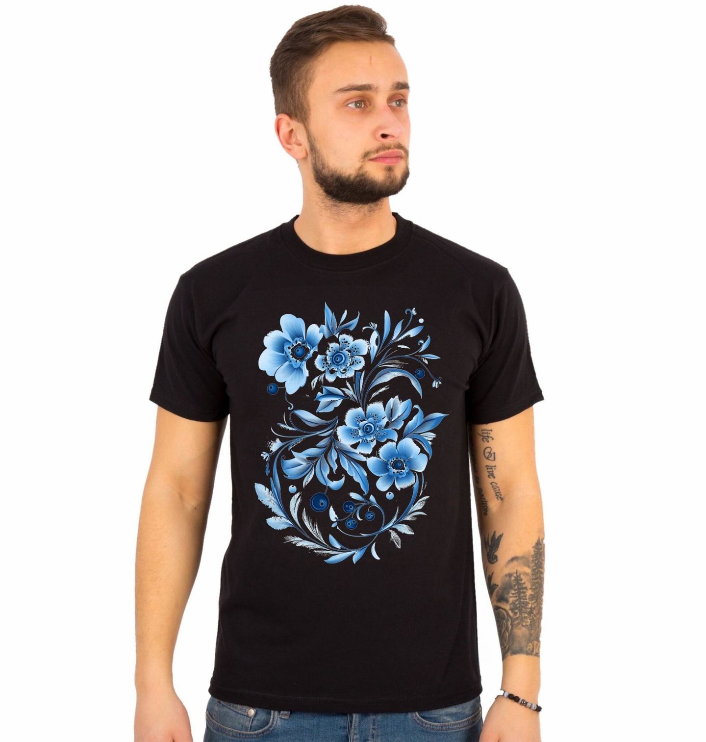 Pánské tričko Modré Folk Květiny. Krásný motiv zachycuje květiny v jemném folk stylu inspirovaném lidovou tvorbou. Ornamentální tvary a modrá barevnost připomínají tradiční vzory, které se objevují v lidovém umění, ale zároveň působí moderně a svěže. Květiny v tomto provedení vyzařují jednoduchou krásu, klid a harmonii. Styl folk dodává motivu nádech tradice, který se snoubí s čistým a elegantním zpracováním.
