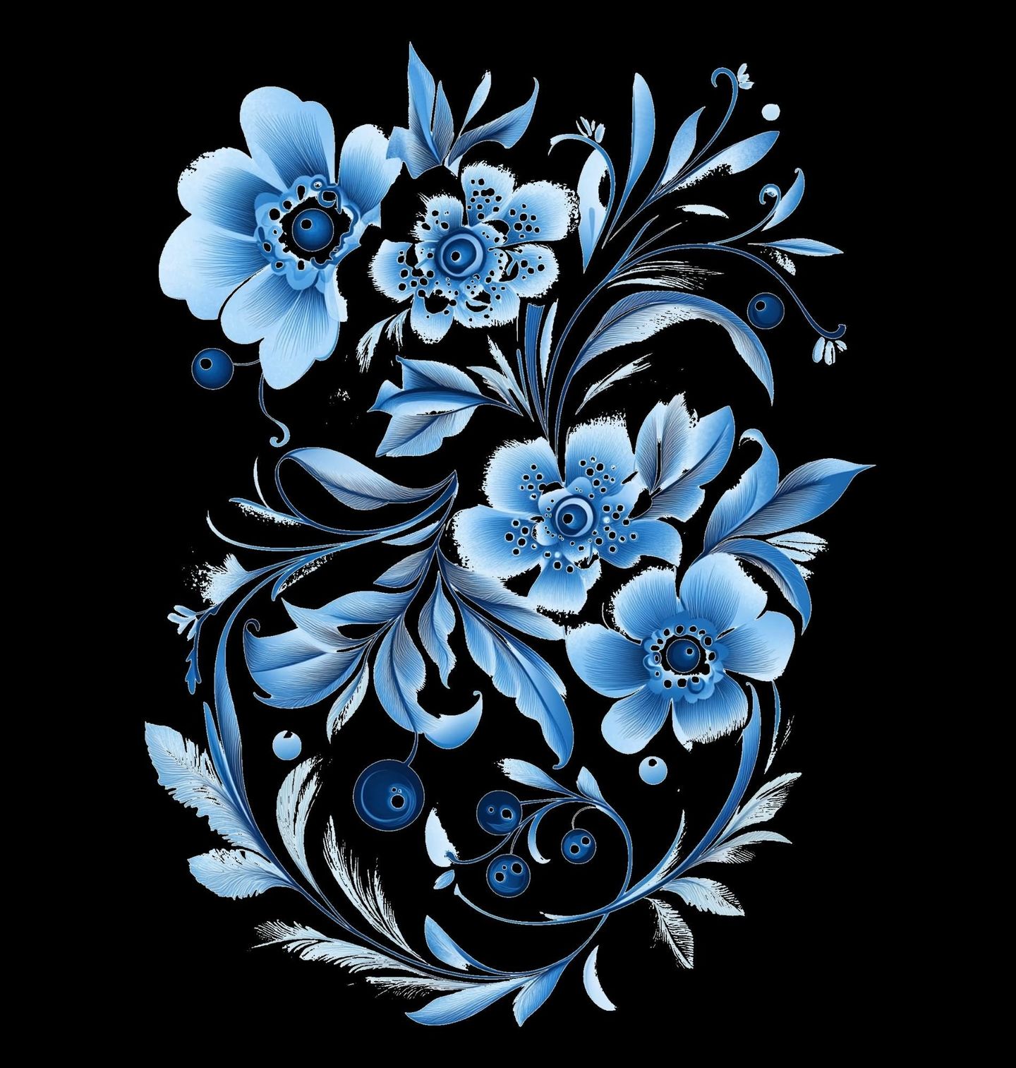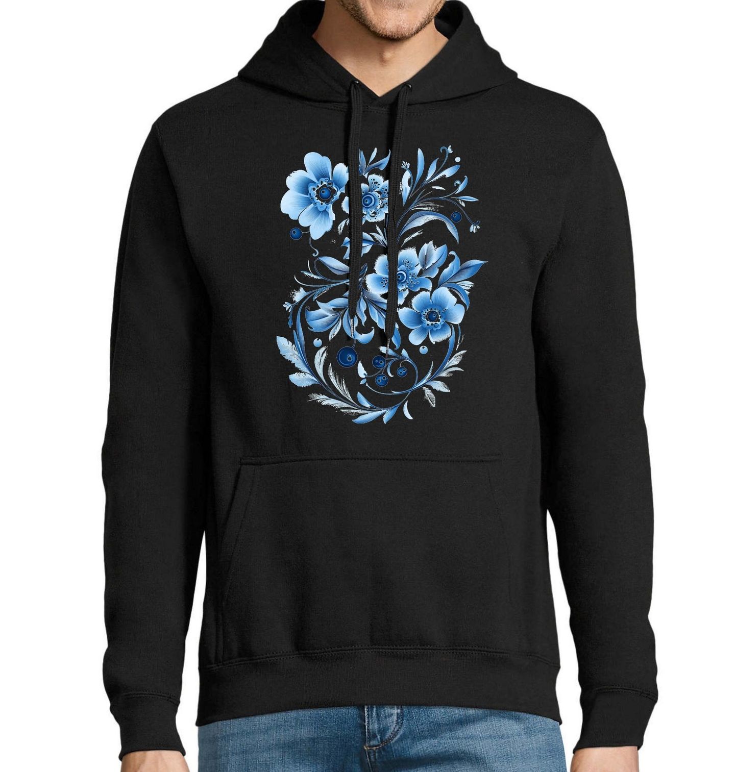 Pánská mikina Modré Folk Květiny. Krásný motiv zachycuje květiny v jemném folk stylu inspirovaném lidovou tvorbou. Ornamentální tvary a modrá barevnost připomínají tradiční vzory, které se objevují v lidovém umění, ale zároveň působí moderně a svěže. Květiny v tomto provedení vyzařují jednoduchou krásu, klid a harmonii. Styl folk dodává motivu nádech tradice, který se snoubí s čistým a elegantním zpracováním.