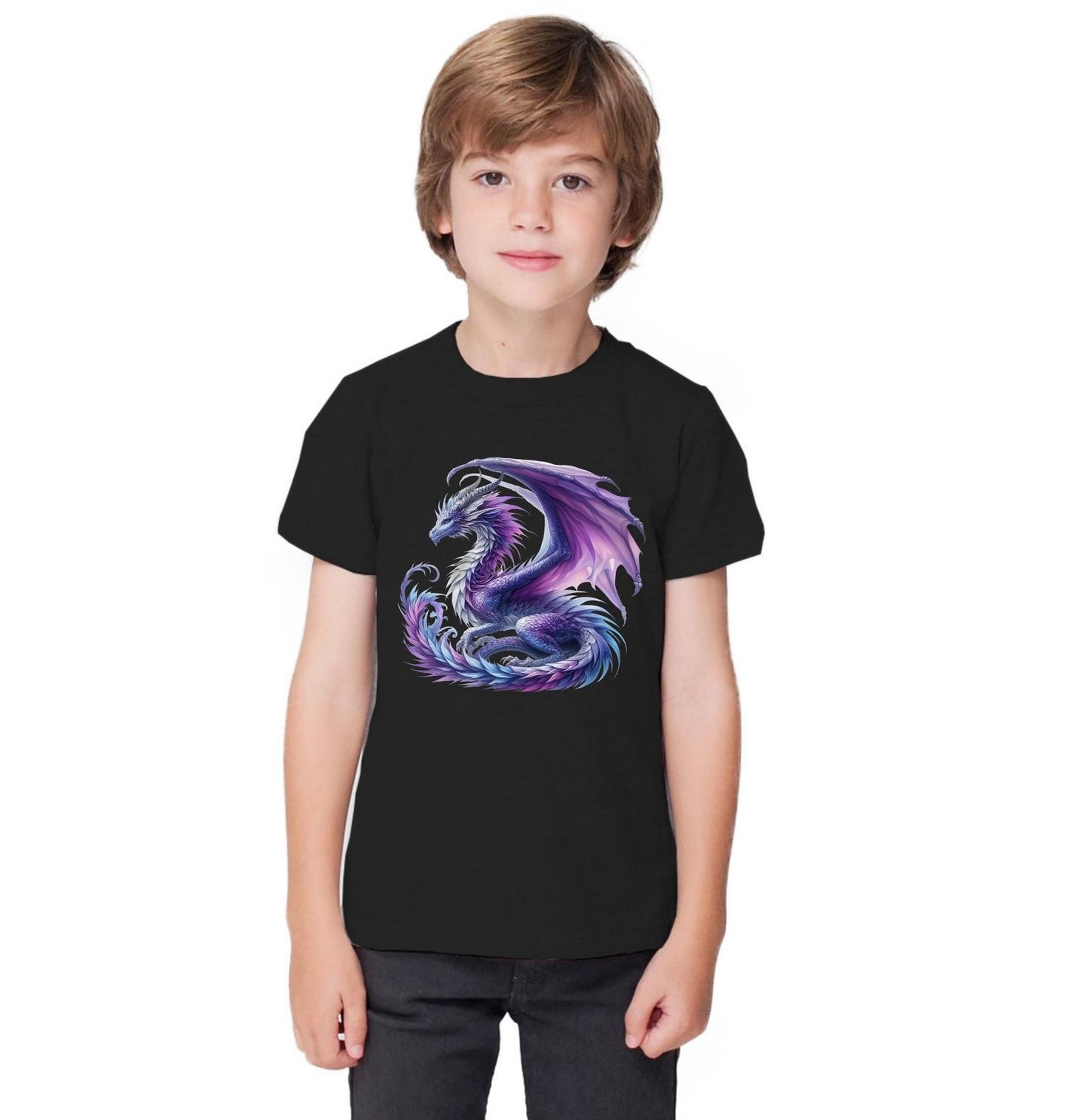 Dětské tričko Modrofialový Drak. Okouzlující motiv, ve kterém se snoubí majestátní drak s jemnými tóny fialové a modré barvy, jako by byl stvořen z křišťálu a měsíčního světla. Tento jedinečný design působí magicky, vznešeně a dokonale vystihuje svět fantasy, kde se realita setkává s kouzlem a tajemnem. Motiv potěší každého milovníka draků, pohádek a magických světů.