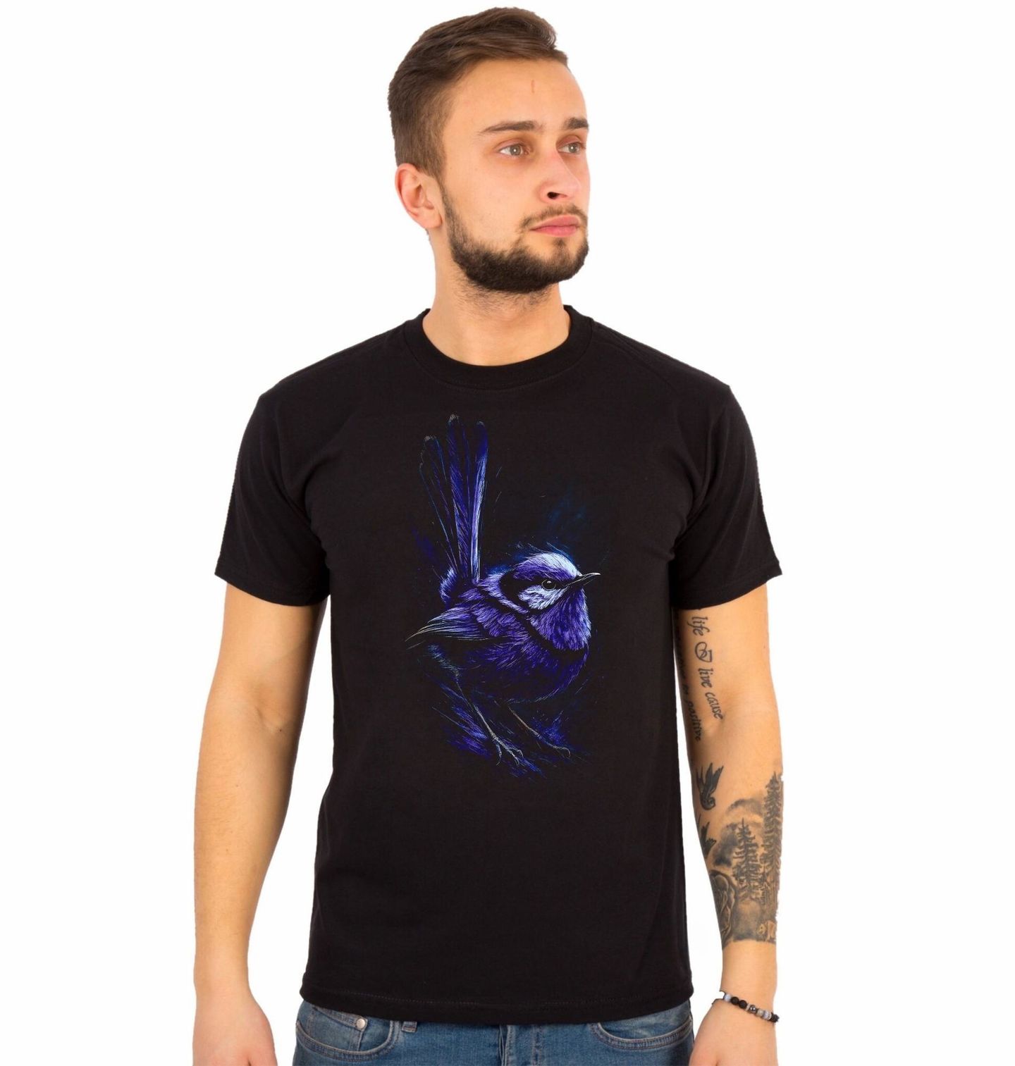 Pánské tričko Modropláštník nádherný. Drobný, ale mimořádně nápadný pěvec pocházející z Austrálie. Samec tohoto druhu je známý svým intenzivně modrým zbarvením, tmavou obličejovou maskou a typicky vztyčeným ocasem, který mu dodává sebevědomý a elegantní vzhled. Modropláštník je pták, jenž symbolizuje radost, vitalitu a krásu divoké přírody.