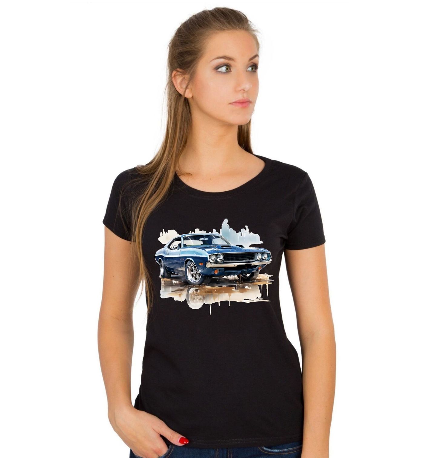 Dámské tričko Modrý Dodge Challenger. Tento působivý motiv zachycuje Dodge Challenger z přelomu 60. a 70. let, ikonické americké auto, které se stalo symbolem éry muscle cars. Dlouhá kapota, široký postoj, čtveřice kulatých světlometů a svalnaté křivky jasně prozrazují sílu a sebevědomí, které Dodge Challenger vždy představoval.