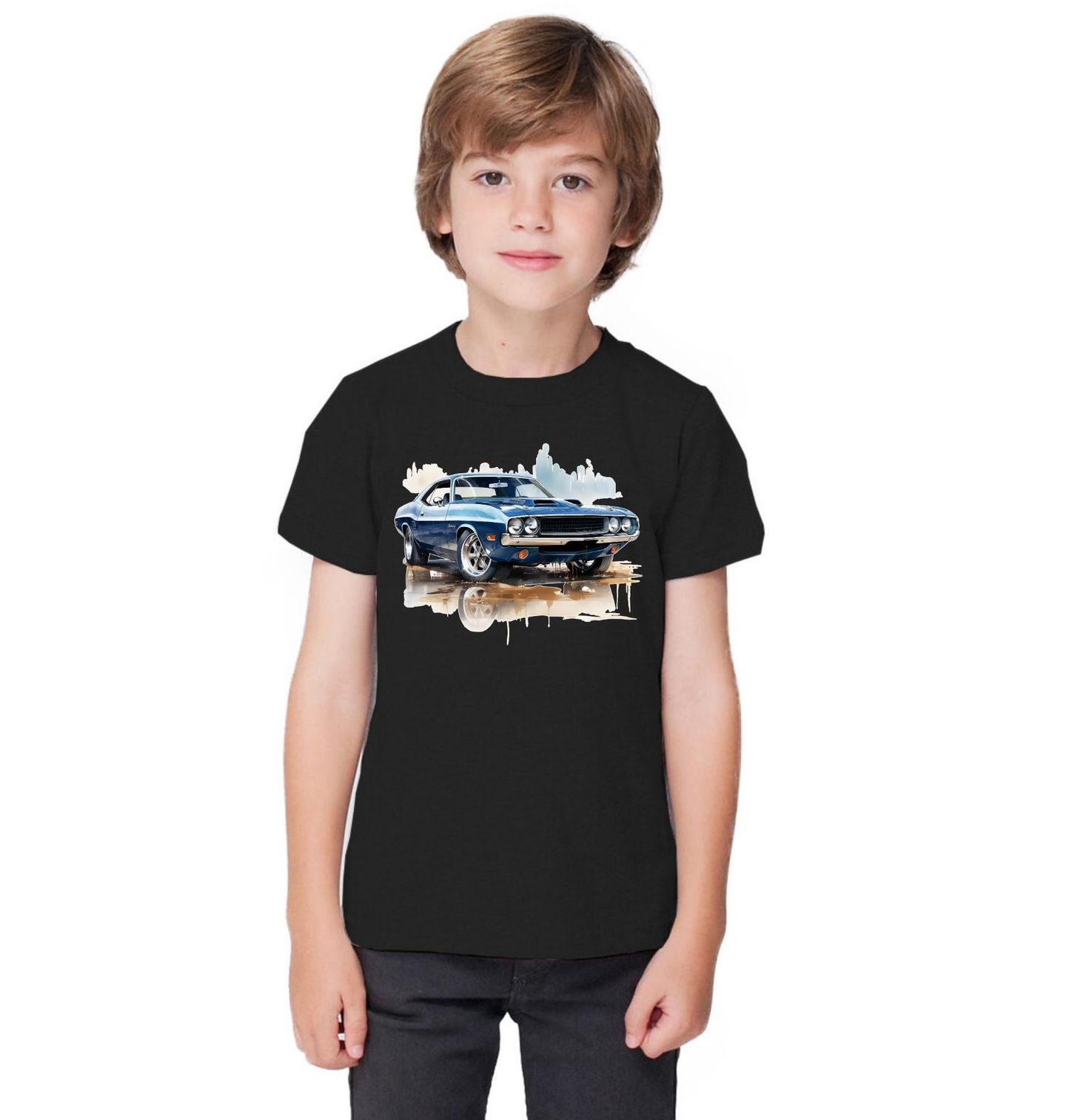 Dětské tričko Modrý Dodge Challenger. Tento působivý motiv zachycuje Dodge Challenger z přelomu 60. a 70. let, ikonické americké auto, které se stalo symbolem éry muscle cars. Dlouhá kapota, široký postoj, čtveřice kulatých světlometů a svalnaté křivky jasně prozrazují sílu a sebevědomí, které Dodge Challenger vždy představoval.