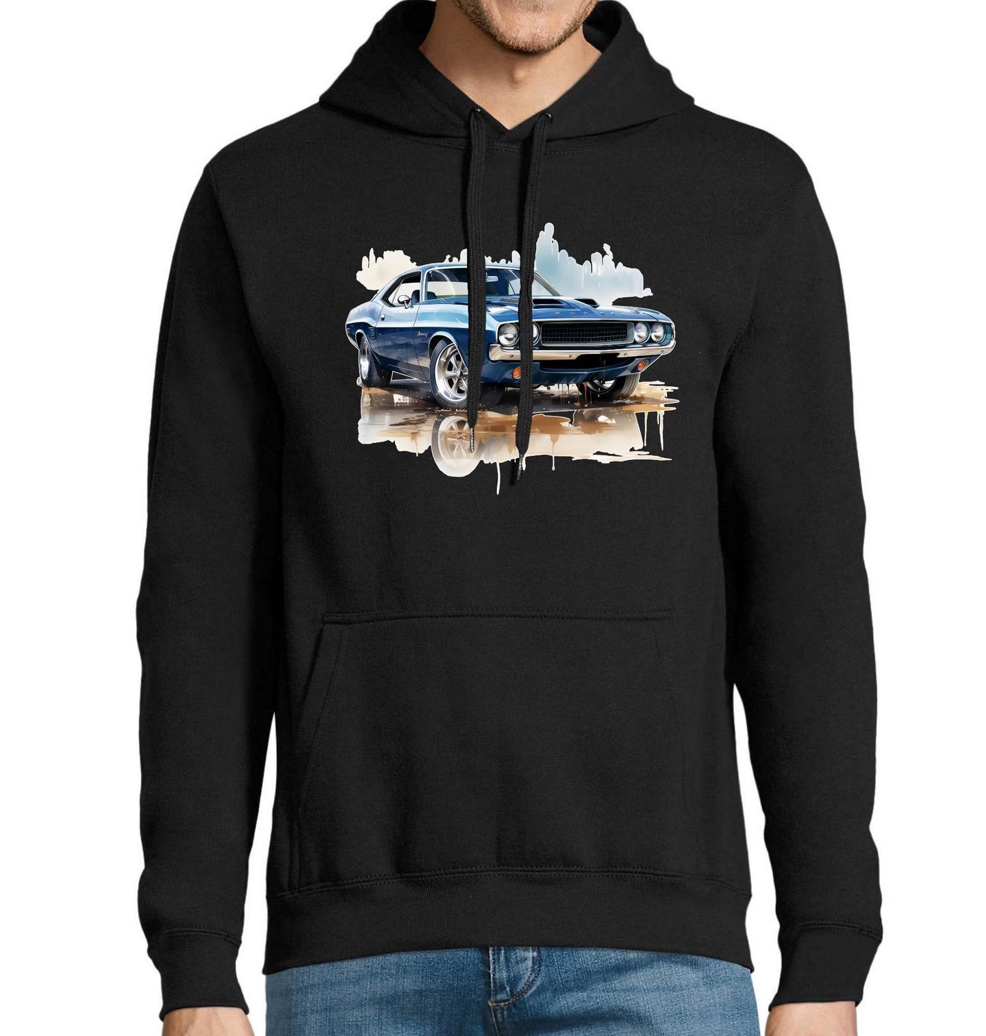 Pánská mikina Modrý Dodge Challenger. Tento působivý motiv zachycuje Dodge Challenger z přelomu 60. a 70. let, ikonické americké auto, které se stalo symbolem éry muscle cars. Dlouhá kapota, široký postoj, čtveřice kulatých světlometů a svalnaté křivky jasně prozrazují sílu a sebevědomí, které Dodge Challenger vždy představoval.