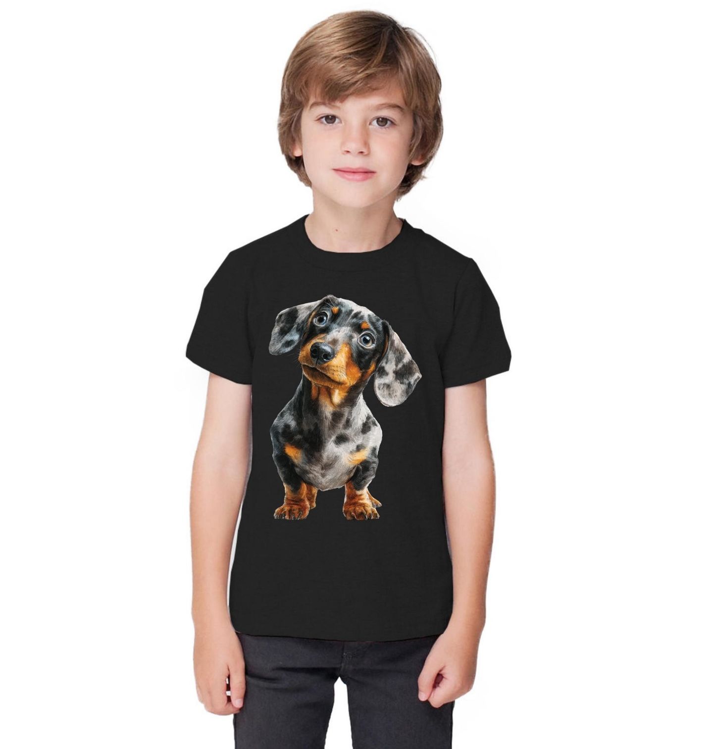 Dětské tričko Modrý Merle Jezevčík Blue Dapple Dachshund. Tento pes je známý svou odvahou, bystrým pohledem a silným poutem k člověku, proto si ho každý pejskař okamžitě zamiluje. Detailní zpracování zvýrazňuje charakter plemene Jezevčík a jeho jedinečný vzhled, který potěší každého milovníka psů.