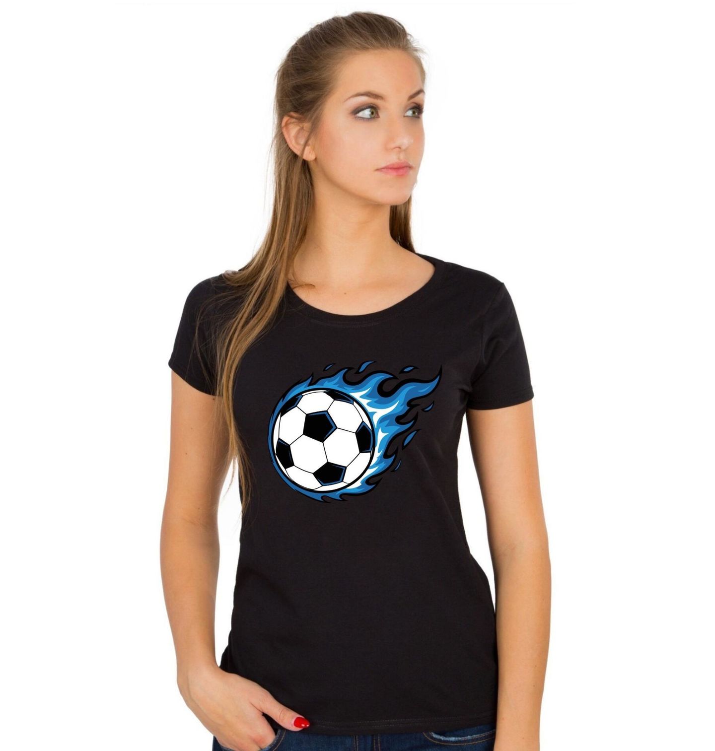 Dámské tričko Modrý Plamen Fotbalu. Rozpoutej vášeň pro sport s tímto stylovým motivem! Ikonický fotbalový míč obklopený modrými plameny symbolizuje rychlost, energii a sílu fotbalového okamžiku. Design je ideální pro všechny milovníky fotbalu, kteří chtějí nosit svou vášeň hrdě na tričku, mikině nebo jiném kousku.