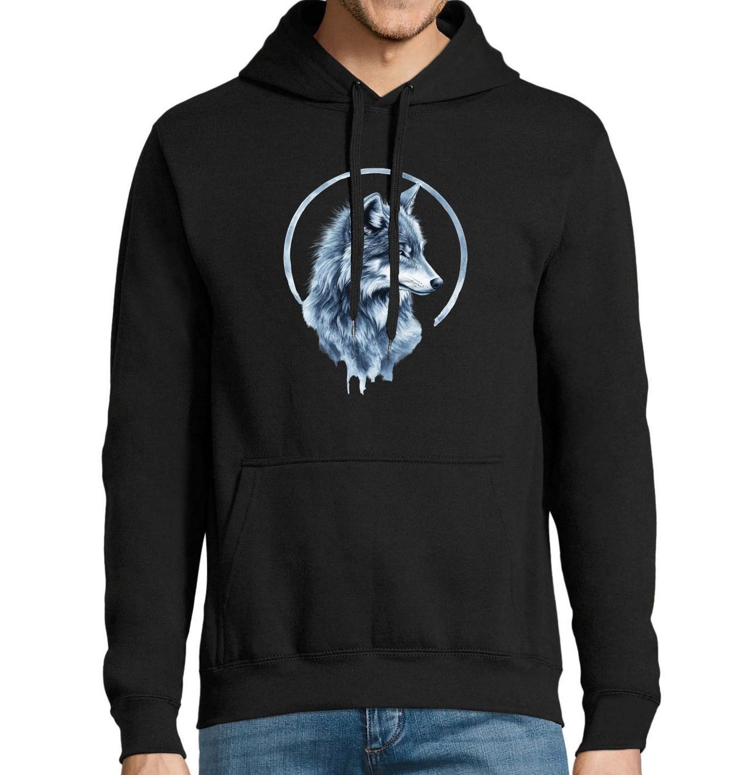 Pánská mikina Modrý Vlk v Měsíčním Kruhu. Tento design zobrazuje majestátního vlka v jemných modrých tónech, obklopeného jednoduchým kruhem, který symbolizuje klid a vyrovnanost. S akvarelovými detaily a minimalistickým přístupem tento motiv vyzařuje tajemství a sílu.