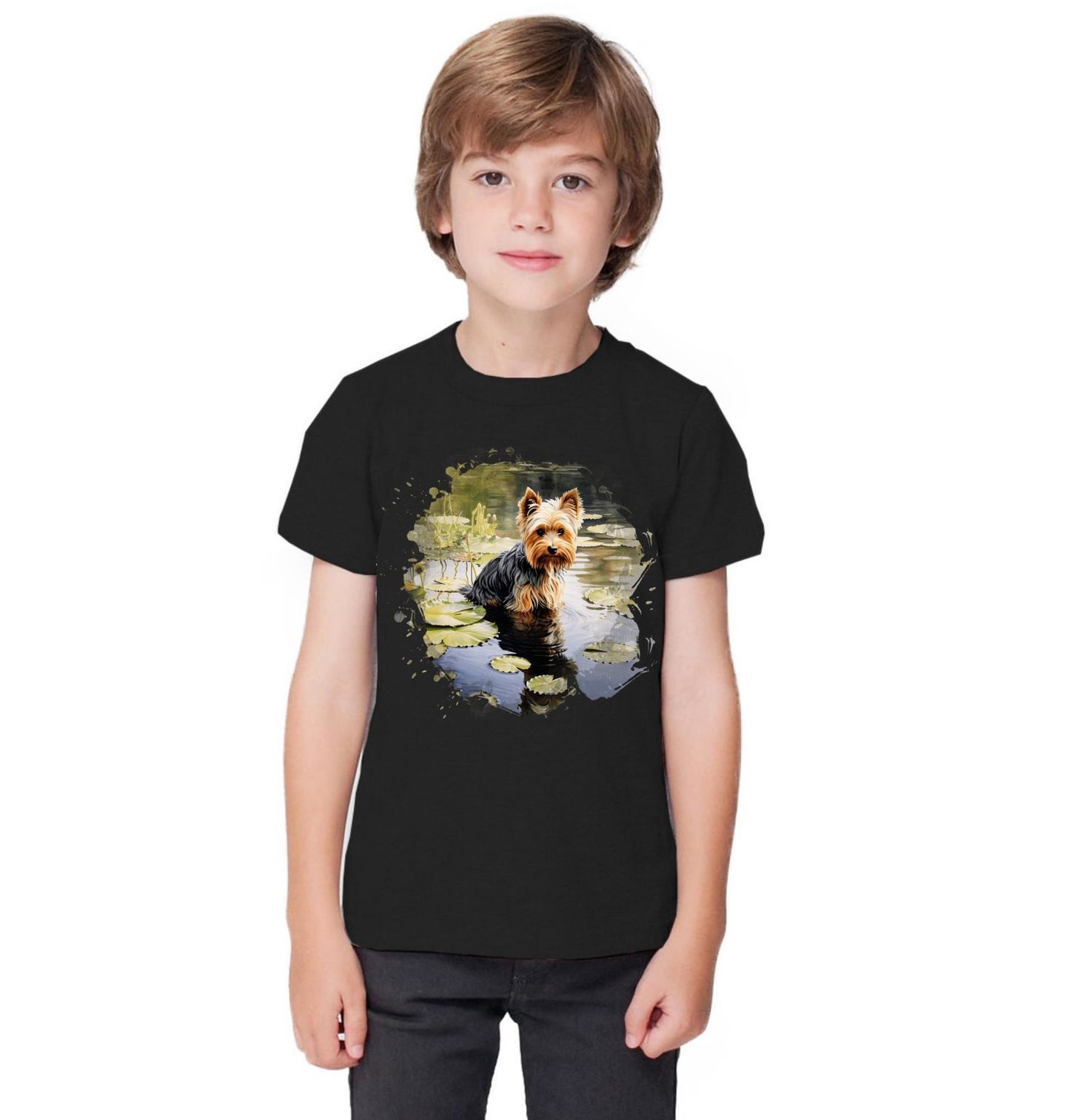 Dětské tričko Mokrý Jorkšírský teriér v Jezírku. Na suchu roztomilý pes, ve vodě neohrožený průzkumník. Jorkšírský teriér si to klidně napochoduje mezi leknín, jako by to byla úplně běžná věc. Každý pejskař ví, že když se řekne „jen se projdeme“, pes slyší „dobrodružství začíná“. Motiv spojuje psí zvědavost, humor a moment, kdy už je pozdě řešit mokré tlapky.