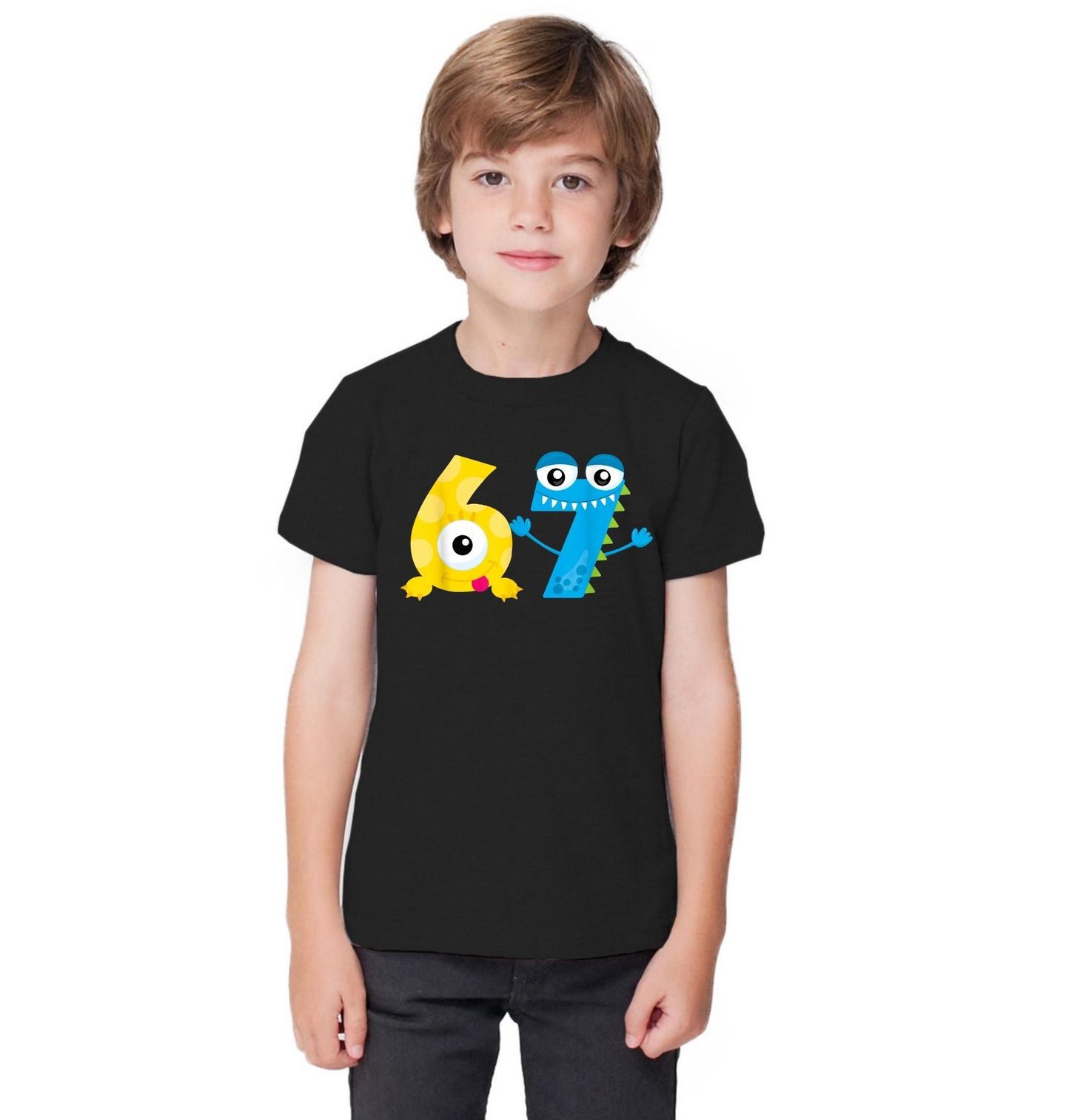 Dětské tričko Monster Numbers 67 Six Seven. Tenhle veselý design 67 promění čísla v roztomilé příšerky, které si zamiluje každé dítě i dospělý s hravou duší. Žlutá šestka s jedním okem a vyplazeným jazykem a modrá sedmička s úsměvem plným zoubků vytváří originální motiv six seven, který působí jako milé a legrační meme.