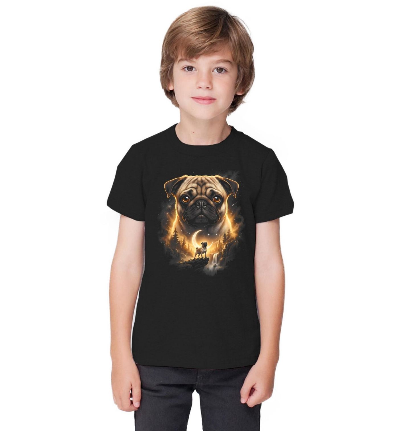 Dětské tričko Mops a Kouzlo Úplňku. Tento originální design představuje psa plemene mops v dramatickém světle úplňku, kde kontrast mezi temnou nocí a zářícím měsícem zdůrazňuje jeho roztomilý, ale výrazný vzhled. Ideální pro milovníky malých, ale charismatických psů.