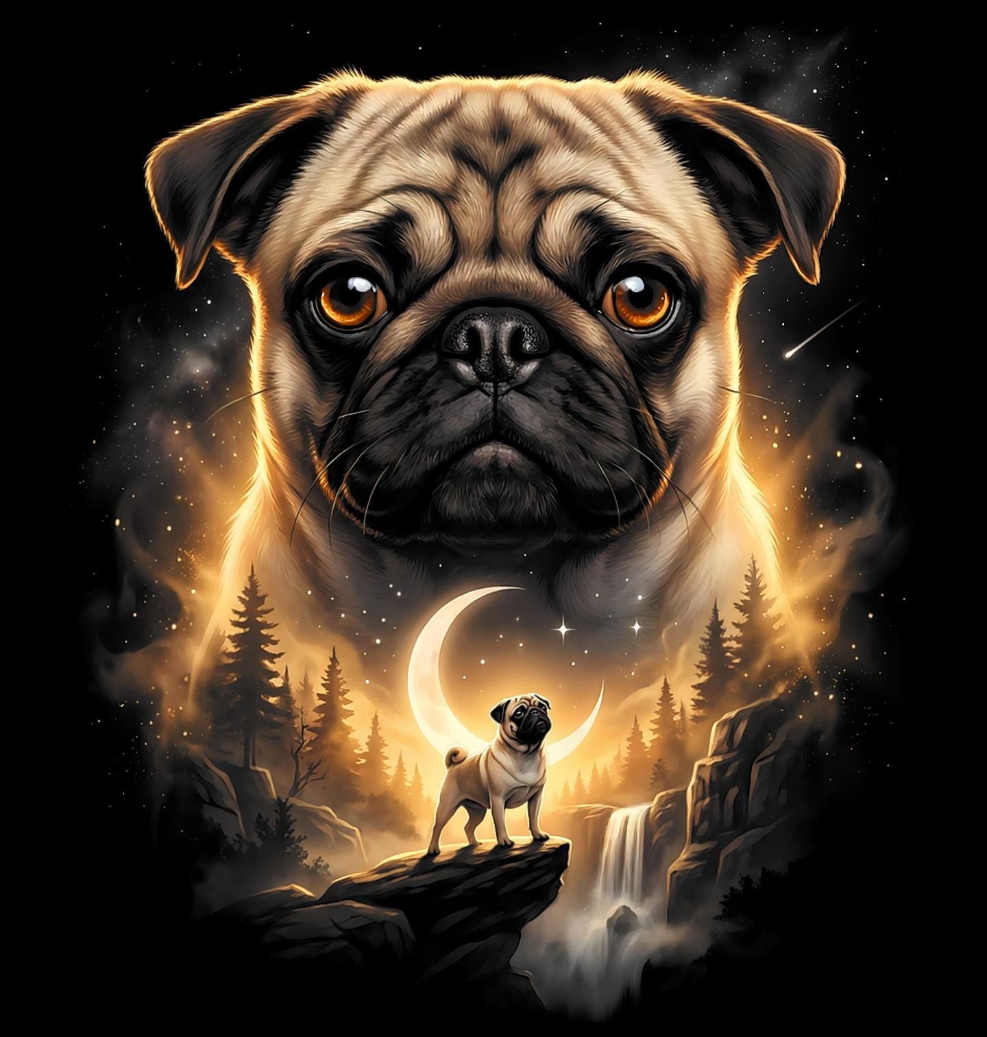 Pánská mikina Mops a Kouzlo Úplňku. Tento originální design představuje psa plemene mops v dramatickém světle úplňku, kde kontrast mezi temnou nocí a zářícím měsícem zdůrazňuje jeho roztomilý, ale výrazný vzhled. Ideální pro milovníky malých, ale charismatických psů.