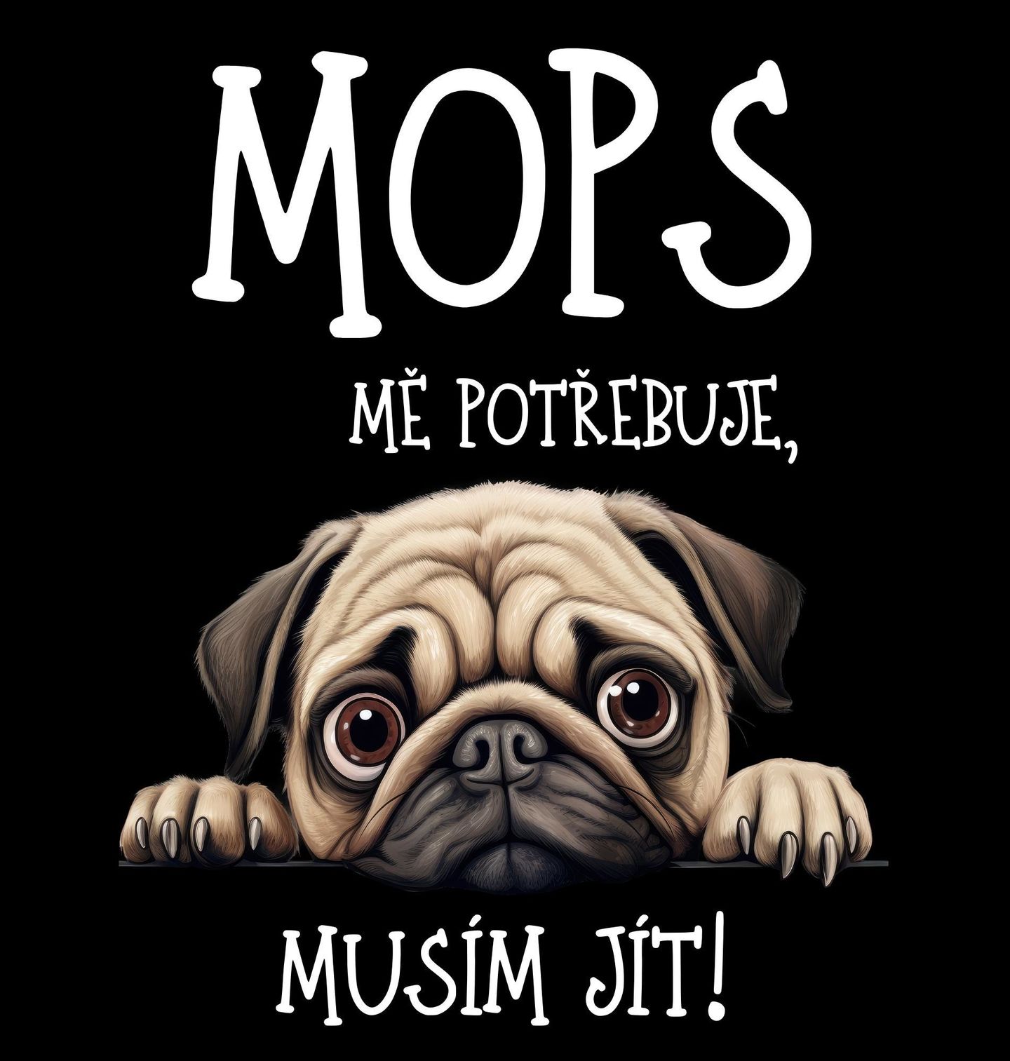 Dámské tričko Mops mě potřebuje, musím jít! Roztomilý motiv s nápisem a detailní ilustrací plemene mops potěší každého, kdo ví, že pes má vždy přednost. Typický výraz, velké oči a vrásčitý čumák dodávají designu jedinečný charakter, který si zamiluje každý pejskař. Tento motiv vystihuje každodenní realitu – když vás volá pes, plány jdou stranou.