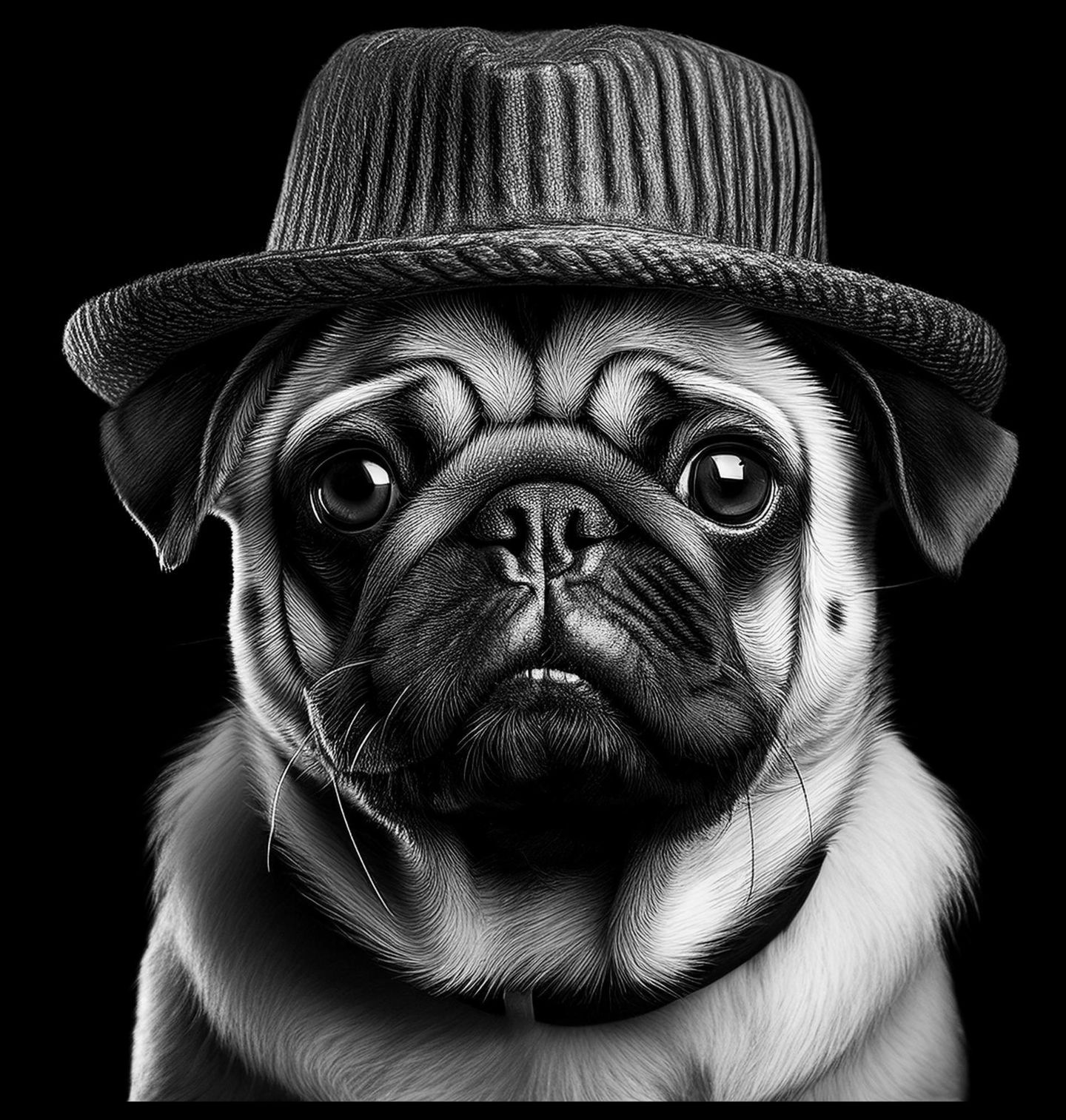 Pánské tričko Mops s Kloboukem. Detailní zpracování zvýrazňuje typický výraz plemene Mops, které si získává srdce svou hravou a přátelskou povahou. Tento stylový motiv je ideální pro každého, kdo je hrdý pejskař a ví, že pes je věrný společník na každý den. Minimalistický černobílý vzhled dodává motivu moderní a nadčasový charakter, díky kterému vynikne na každém produktu.