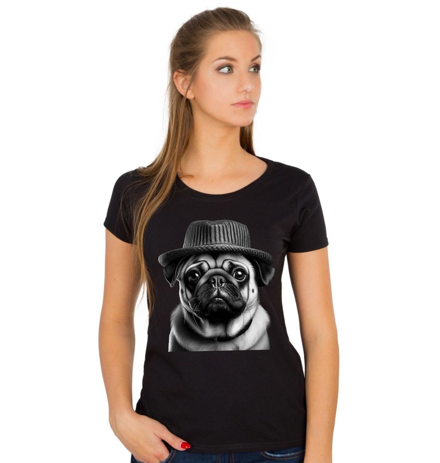 Dámské tričko Mops s Kloboukem. Detailní zpracování zvýrazňuje typický výraz plemene Mops, které si získává srdce svou hravou a přátelskou povahou. Tento stylový motiv je ideální pro každého, kdo je hrdý pejskař a ví, že pes je věrný společník na každý den. Minimalistický černobílý vzhled dodává motivu moderní a nadčasový charakter, díky kterému vynikne na každém produktu.