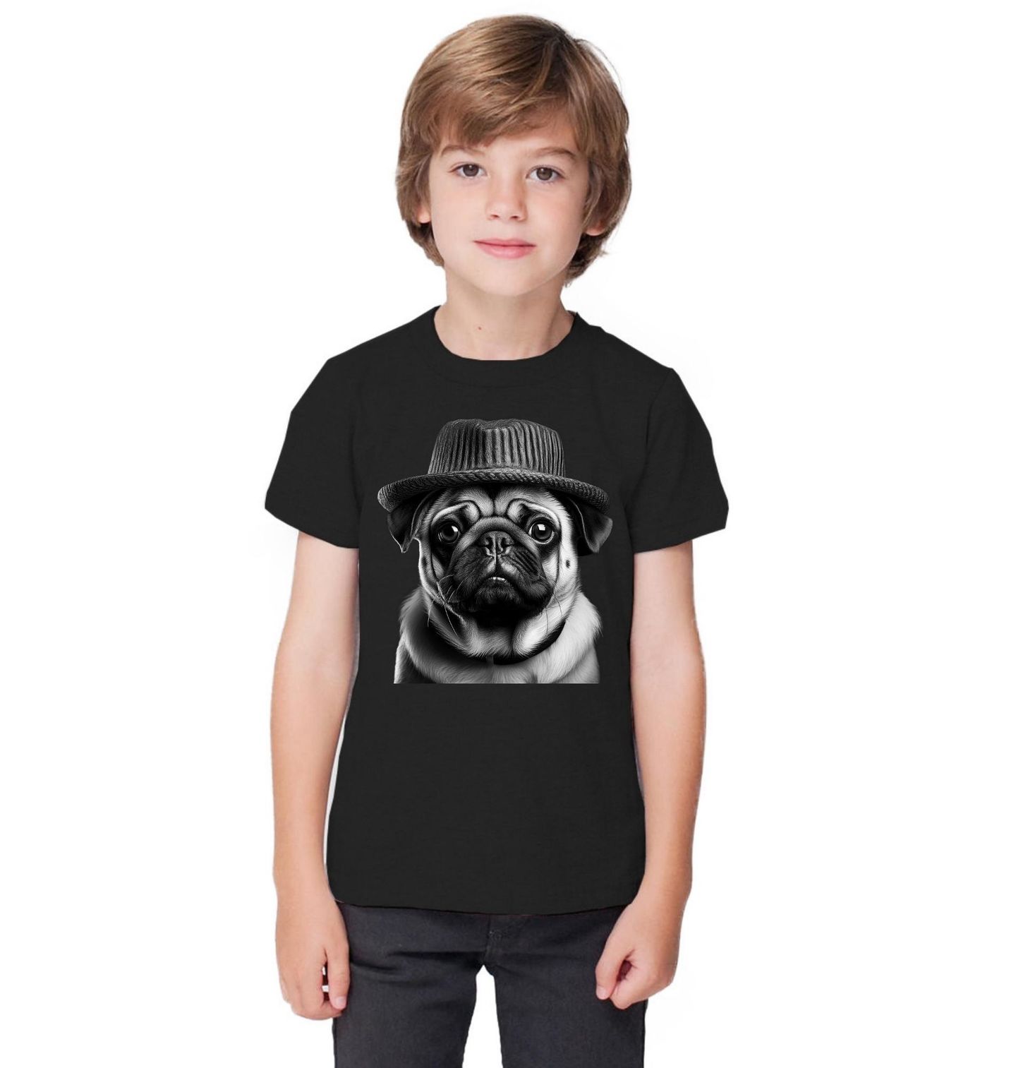 Dětské tričko Mops s Kloboukem. Detailní zpracování zvýrazňuje typický výraz plemene Mops, které si získává srdce svou hravou a přátelskou povahou. Tento stylový motiv je ideální pro každého, kdo je hrdý pejskař a ví, že pes je věrný společník na každý den. Minimalistický černobílý vzhled dodává motivu moderní a nadčasový charakter, díky kterému vynikne na každém produktu.