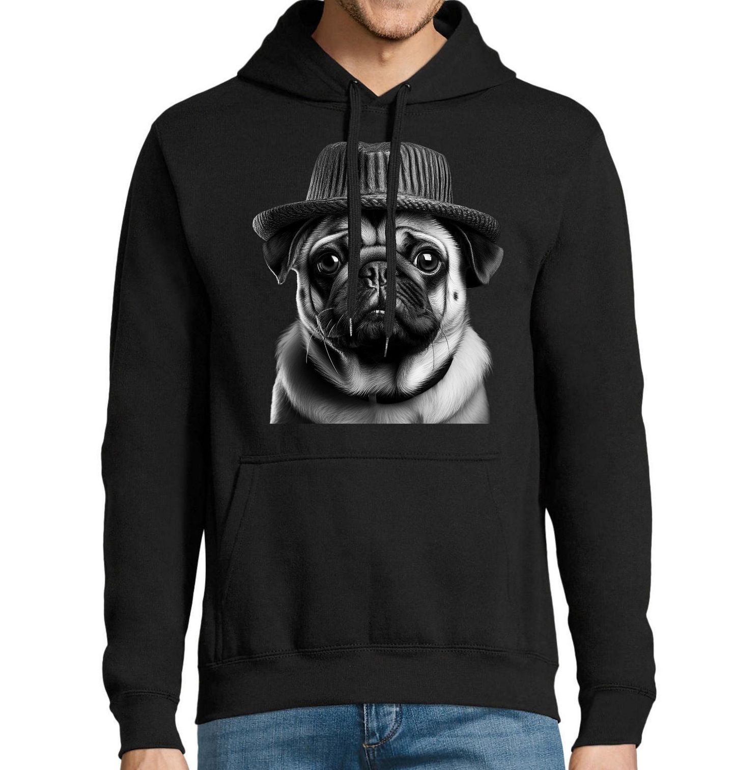 Pánská mikina Mops s Kloboukem. Detailní zpracování zvýrazňuje typický výraz plemene Mops, které si získává srdce svou hravou a přátelskou povahou. Tento stylový motiv je ideální pro každého, kdo je hrdý pejskař a ví, že pes je věrný společník na každý den. Minimalistický černobílý vzhled dodává motivu moderní a nadčasový charakter, díky kterému vynikne na každém produktu.
