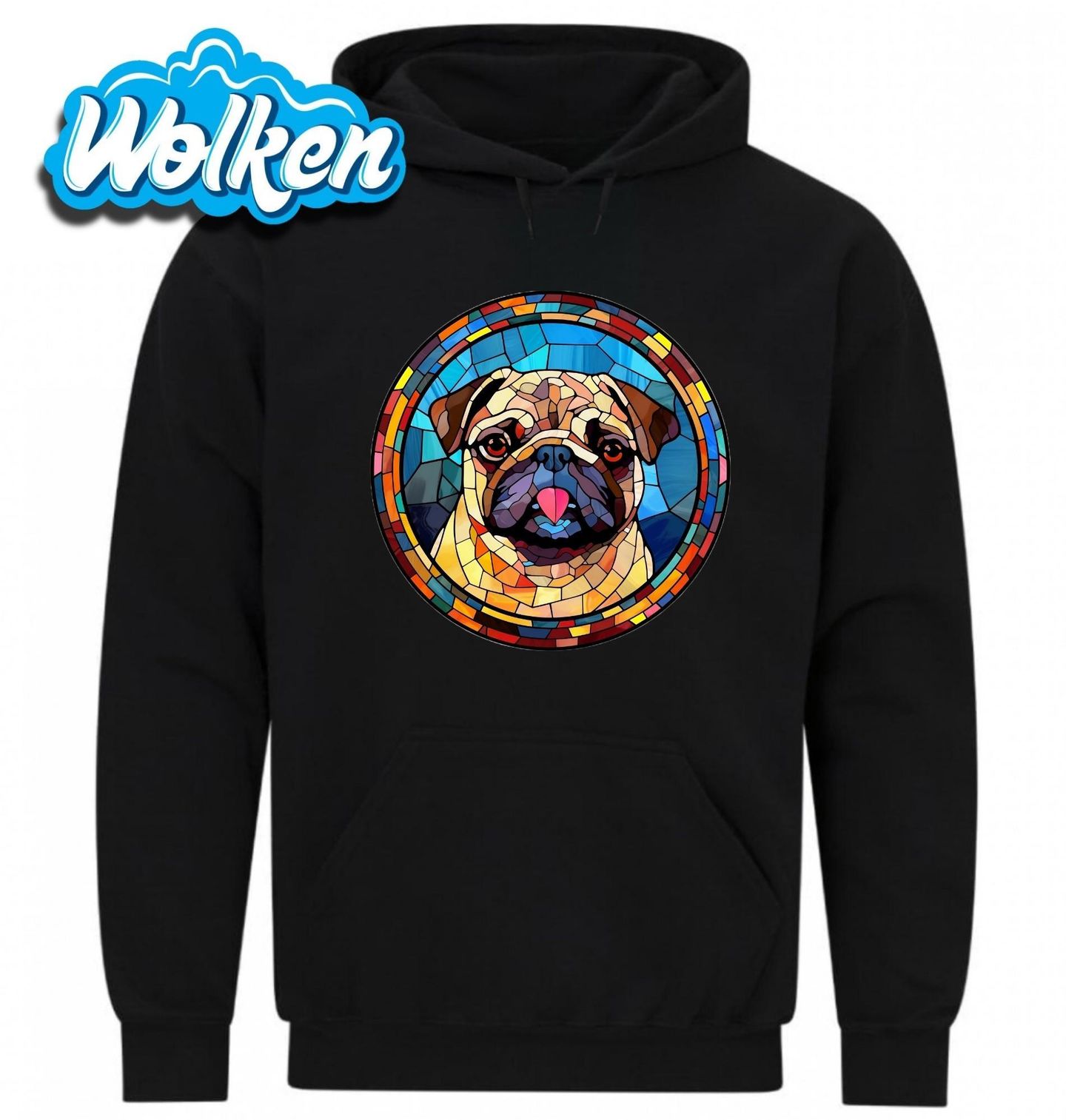 Pánská mikina Mopsí Vitráž Stained Glass. Barevný a hravý motiv, ve kterém pes mops s vyplazeným jazykem září jako drahokam v kruhovém vitrážovém rámu. Skvělá volba pro každého pejskaře, který miluje tohoto ikonického psa pro jeho komický výraz a dobrosrdečnost.