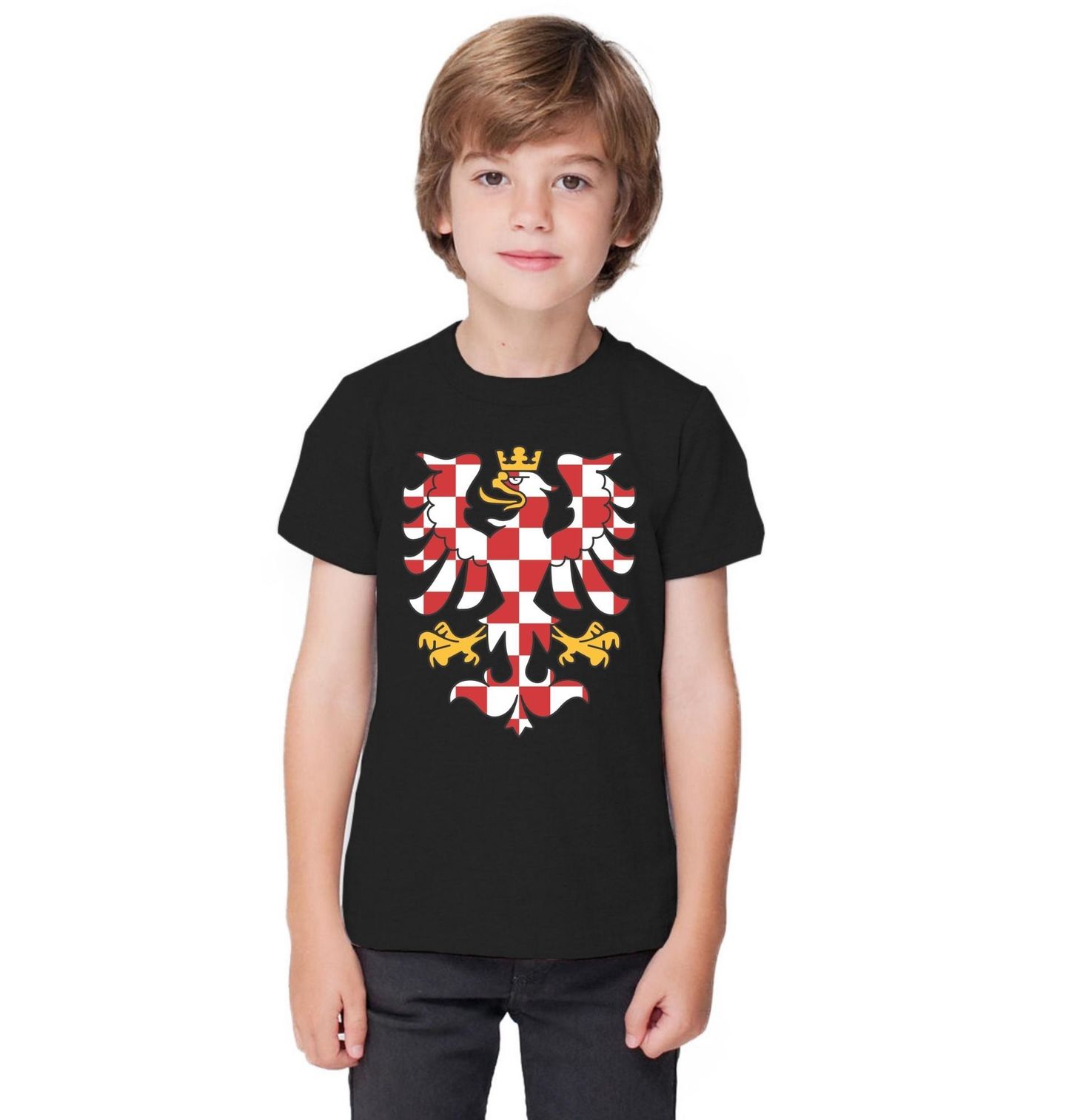 Dětské tričko Moravská orlice. Tento motiv zobrazuje moravskou orlici, což je tradiční heraldický symbol Moravy a významná součást historických znaků pro Česko. Moravská orlice je šachovaná červeno-stříbrná orlice se zlatou korunou na modrém poli a patří mezi zemské znaky, které tvoří heraldickou tradici.