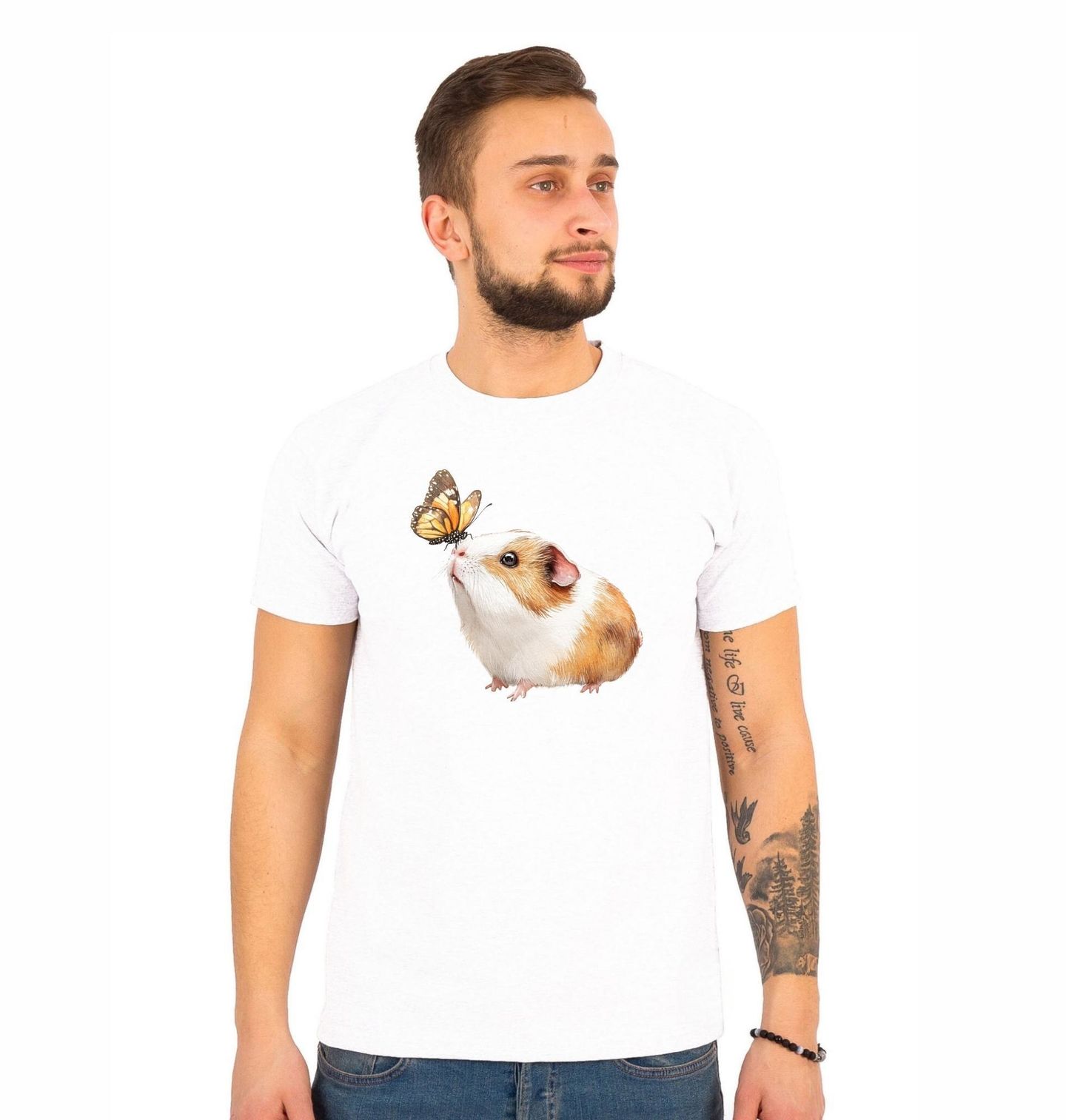 Pánské tričko Morče hladkosrsté s Motýlem. Něžný a klidný motiv zachycující morče v tichém okamžiku, kdy mu na čumáčku usedl motýl. Podle vzhledu jde o hladkosrsté domácí morče, často označované jako americké morče. Design potěší všechny milovníky zvířat, roztomilých ilustrací a přírodních detailů.