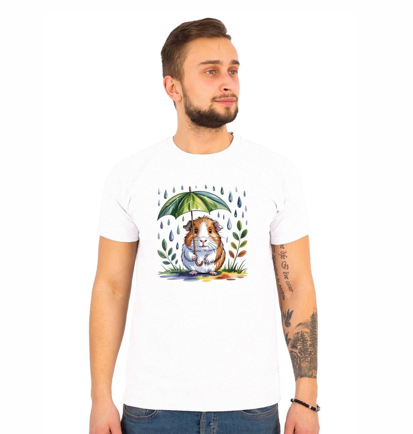 Pánské tričko Morče hladkosrsté v Dešti. Roztomilý a veselý motiv, na kterém je morče schované pod listovým deštníkem, zatímco kolem něj padá déšť. Podle vzhledu jde o krátkosrsté domácí morče, nejblíže typu americké (hladkosrsté) morče, s typickým zbarvením hnědo-bílé kombinace.