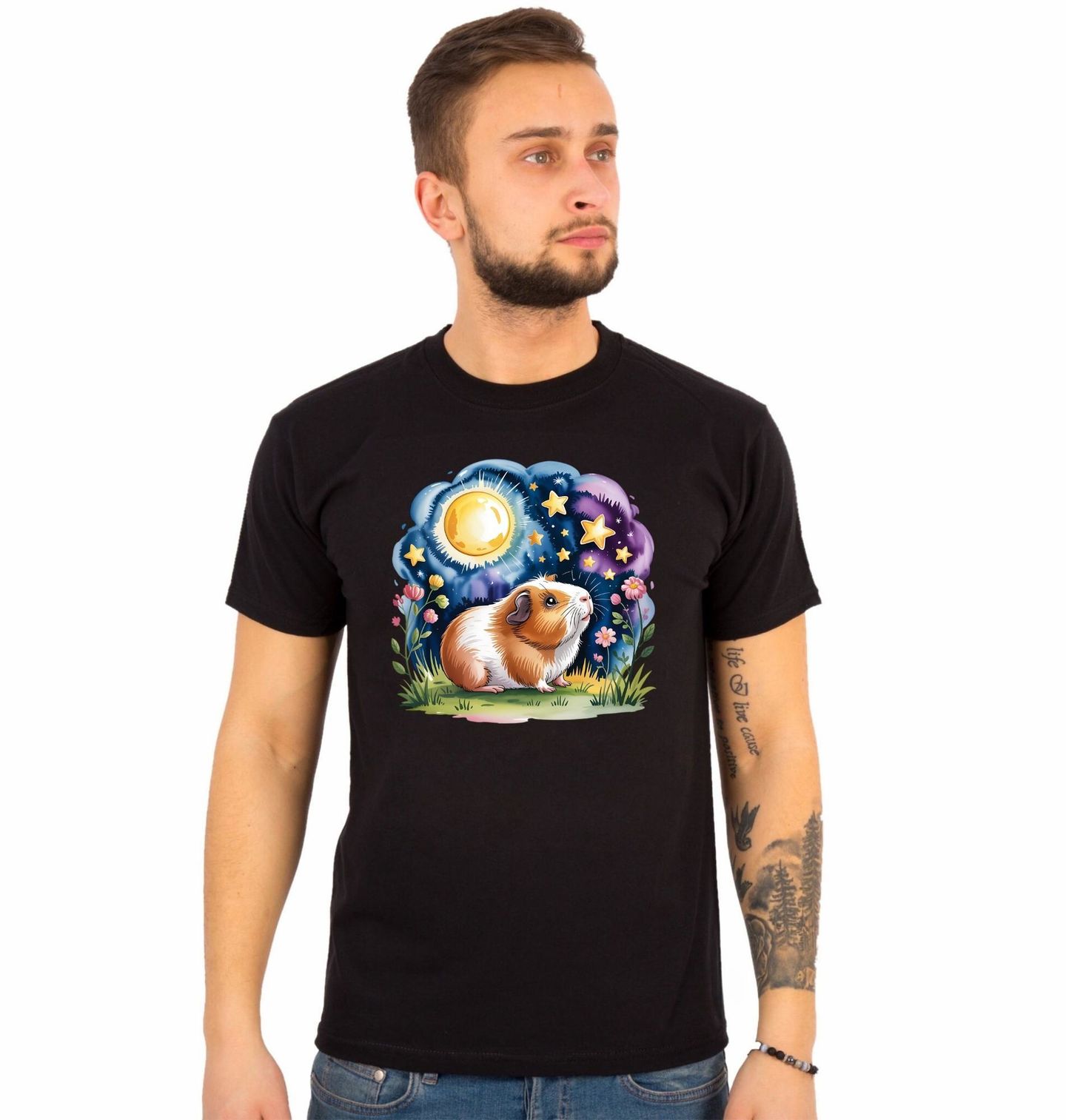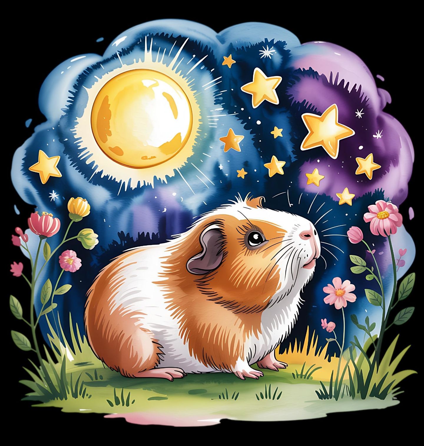 Pánské tričko Morče pod Kouzelnými Hvězdami. V jedné tiché noci, když se na obloze rozzáří měsíc a usmějí se hvězdy, sedí v trávě malé morče a sní své hebké sny. Květiny šeptají pohádky, noc je klidná a svět je plný kouzel. Tento roztomilý motiv je jako ilustrace z dětské knížky – plný fantazie, jemných barev a pohody. Potěší děti i dospělé, kteří mají rádi pohádky a svět plný snů.