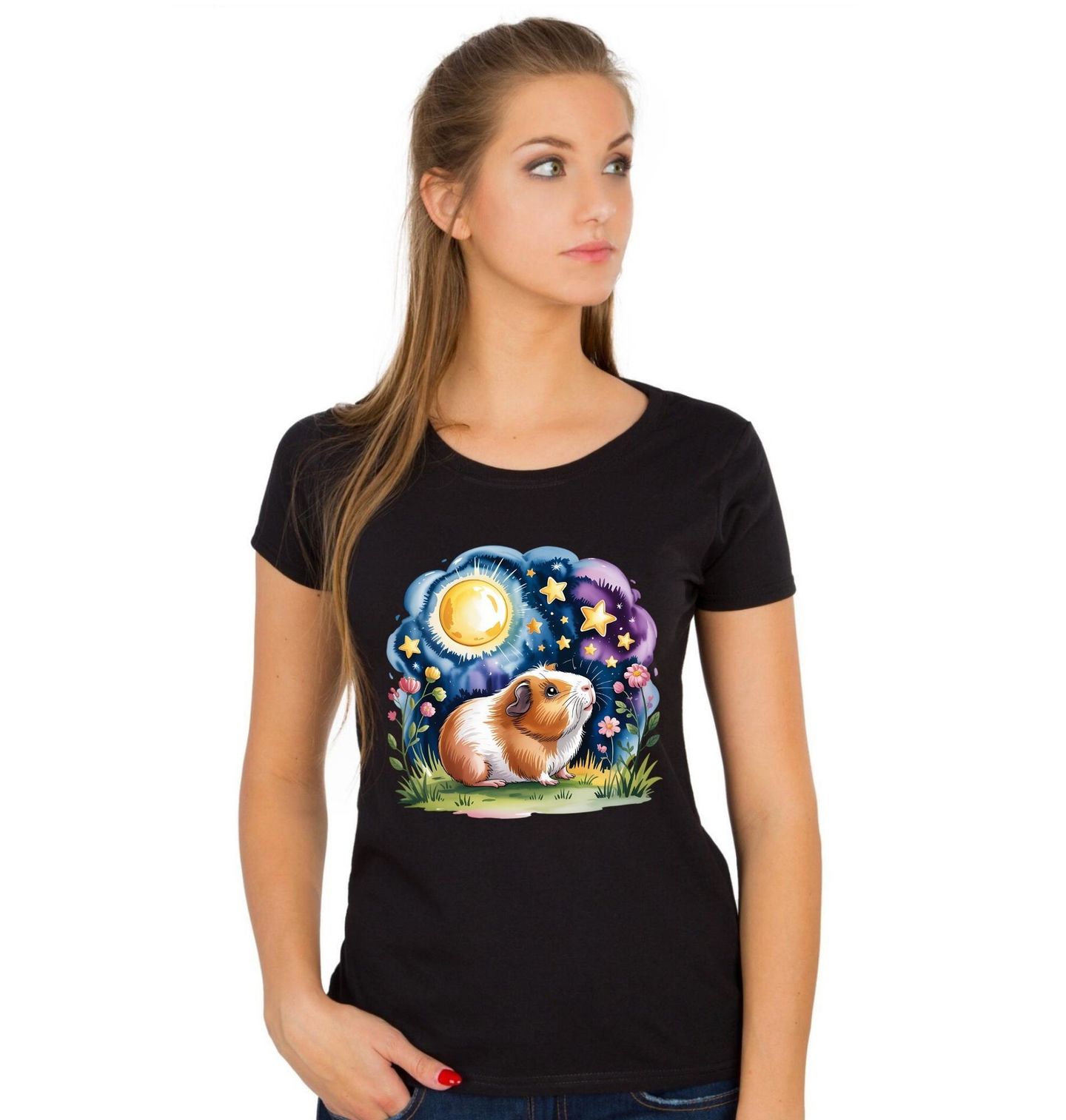 Dámské tričko Morče pod Kouzelnými Hvězdami. V jedné tiché noci, když se na obloze rozzáří měsíc a usmějí se hvězdy, sedí v trávě malé morče a sní své hebké sny. Květiny šeptají pohádky, noc je klidná a svět je plný kouzel. Tento roztomilý motiv je jako ilustrace z dětské knížky – plný fantazie, jemných barev a pohody. Potěší děti i dospělé, kteří mají rádi pohádky a svět plný snů.
