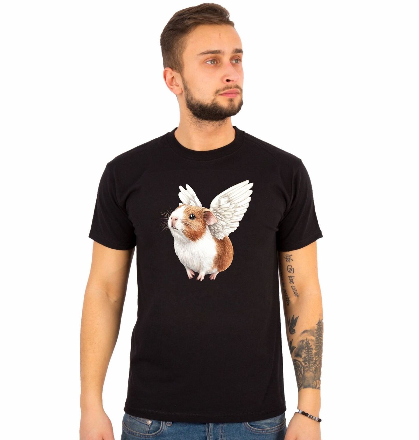 Pánské tričko Morče s Andělskými Křídly RIP. Jemný a pohádkový motiv zobrazuje malé domácí zvířátko, kde je morče s bílými andělskými křídly. Roztomilý výraz a hebká srst dělají z ilustrace něžný a pozitivní obrázek, který potěší každého milovníka těchto přátelských tvorečků. Tento design je ideální pro všechny, kterým morče přináší radost, klid a úsměv každý den - tady je totiž morče jako opravdový andílek.
