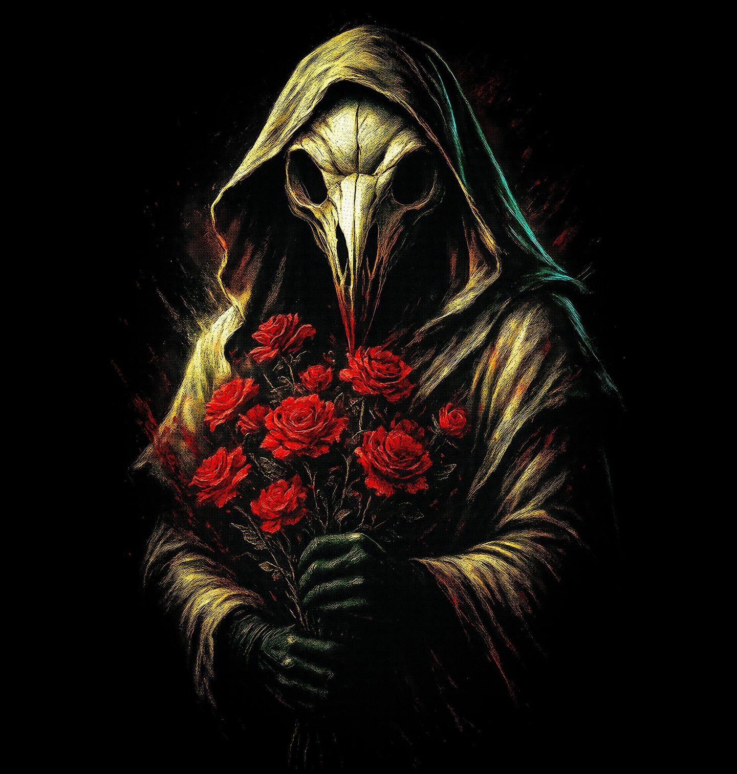 Pánská mikina Morový Doktor Květiny na Hrob. Temný a silně atmosférický motiv, ve kterém vystupuje ikonický doktor morových časů, držící rudé květiny jako symbol života i smrti. Tento design propojuje historickou postavu s hlubokou emocí – květiny zde představují vzpomínku, ztrátu i tichou úctu. Morový doktor byl symbolem boje proti smrti – a právě proto zde drží květiny jako připomínku těch, kteří odešli, ale zůstávají v paměti.